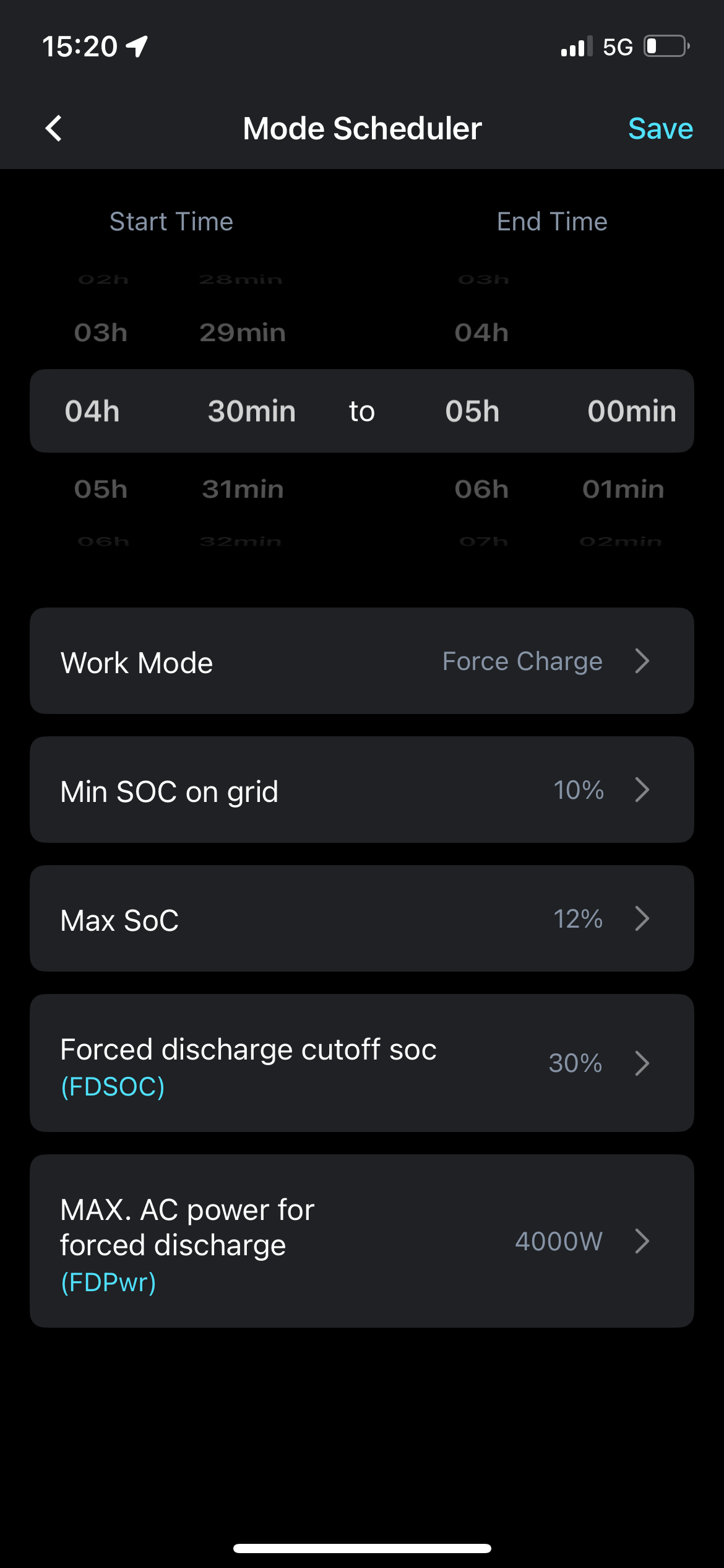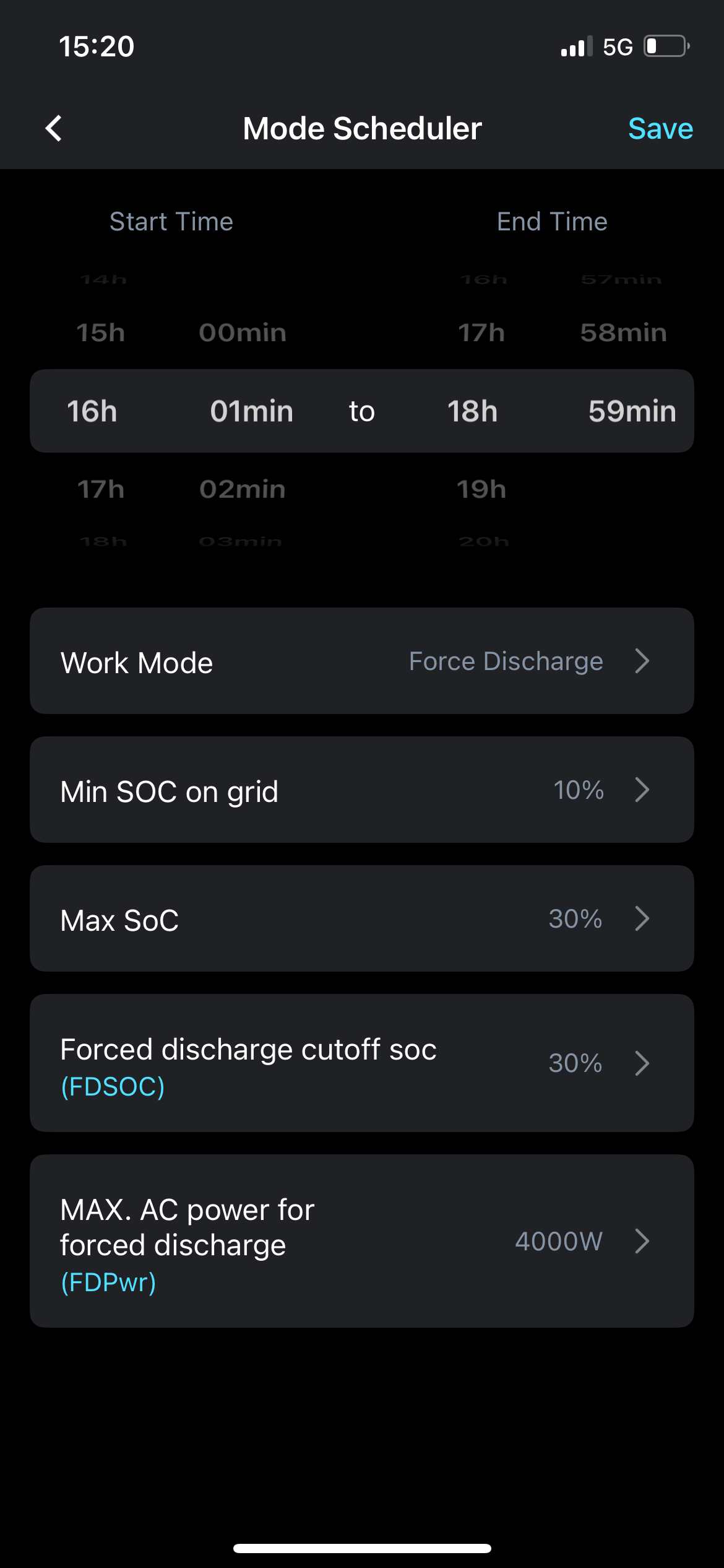 The only other entry in my mode scheduler is Forced discharge, min SOC on grid 10%, FDSOC 30%, FDPwr 4000W. This works fine on its own and discharges to 30% as required.