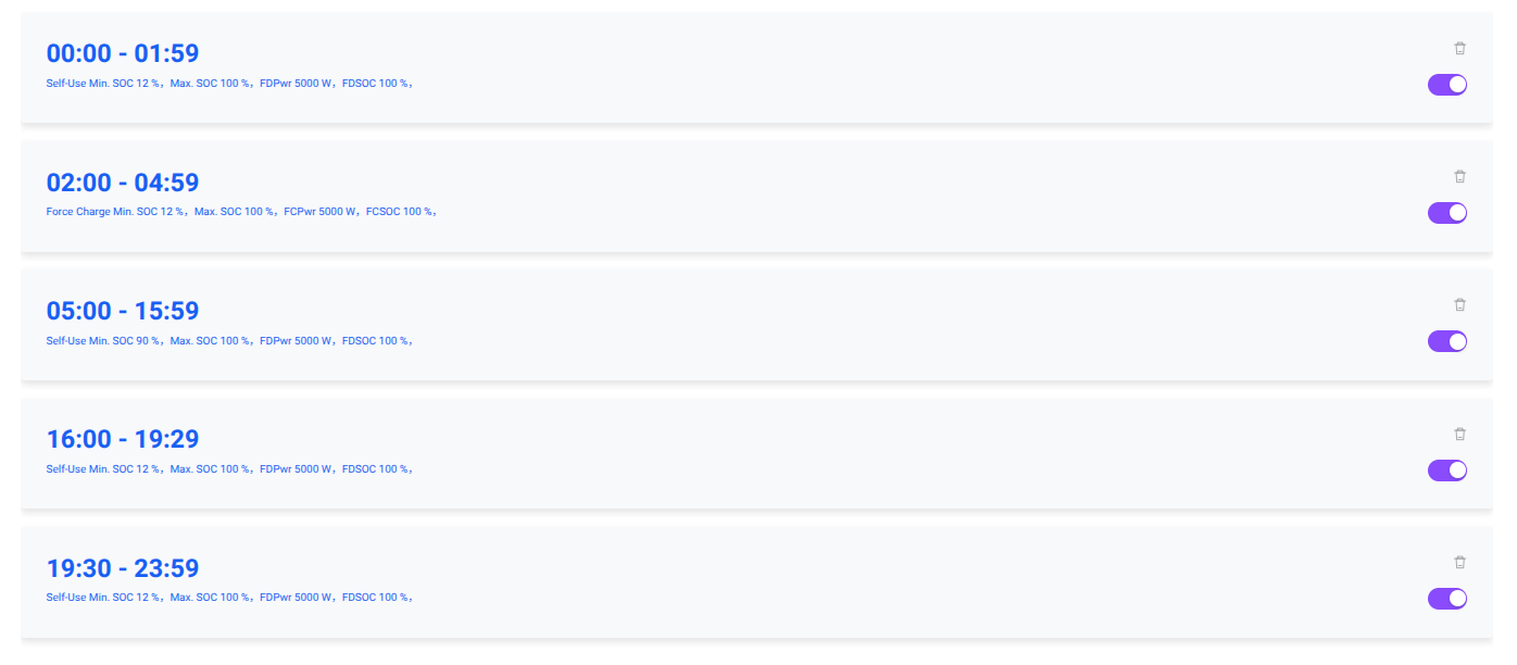 Note it does follow the schedules even to the point that with the messing around over the days a typo was in the schedule. The 5-16 time slot was set to 90% and it did indeed follow that drawing current from the grid and not my battery leaving it at 92%. Changing it to a MSOC of 12% it did start drawing from battery again.
