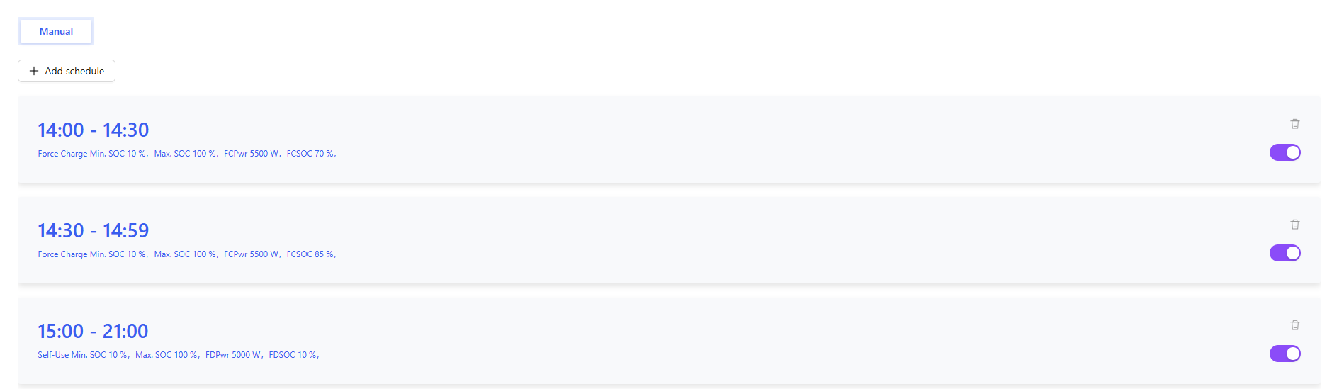 I am trying to use mode scheduler to gradually charge my battery to ensure it is at least 85% full when my peak schedule kicks in at 15:00. I don't want to just dump from the grid directly into my battery though, because there is a considerable amount of solar being generated that I can't export, so I want to gradually increase the battery SOC.