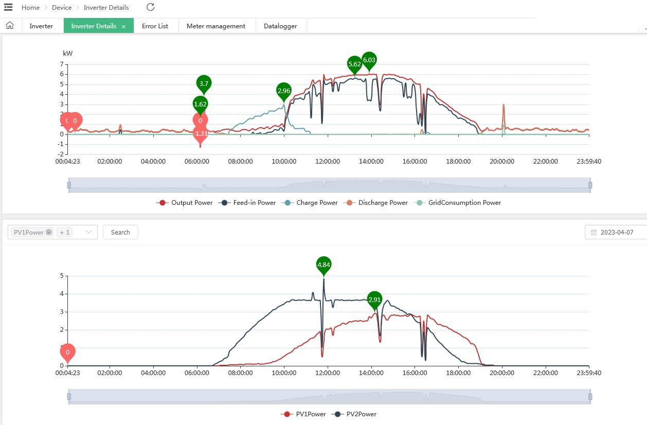 can someone explain what's going on here? We have a FoxESS 6.0kW inverter with two strings, one (PV2) of 12 panels orientated SSE and one (PV1) of 8 panels orientated WSW