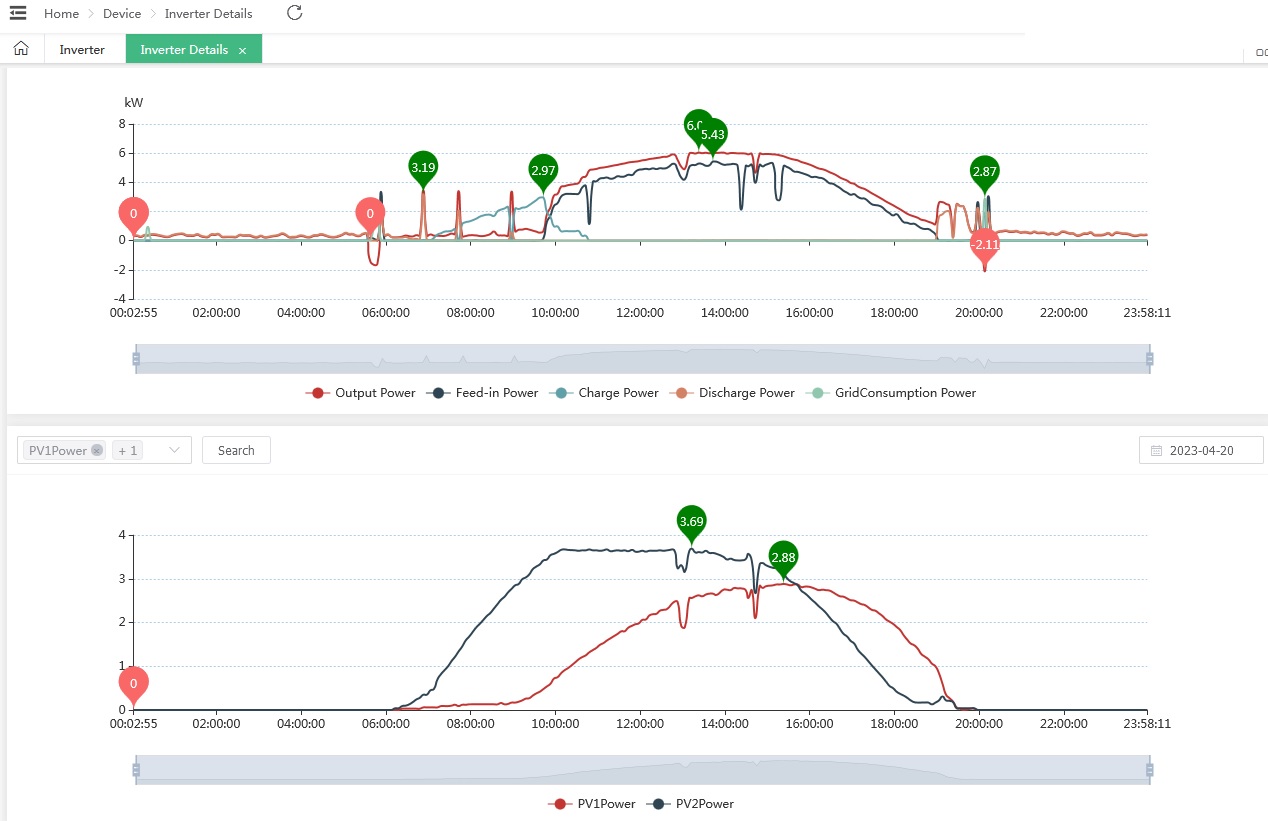 With the recent better weather we have seen good nominal production with peaks up to close to the expected capacity of the panels. However, instead of power coming up in a sinusoid (in a perfect case with no cloud) we see PV2 clipping or flat-lining at 3.65kW (apart from occasional transient spikes). PV1 typically behaves as expected. It does this even when the total power from both strings combined is less than 6kW. This can be seen most clearly in the 200423a plot.