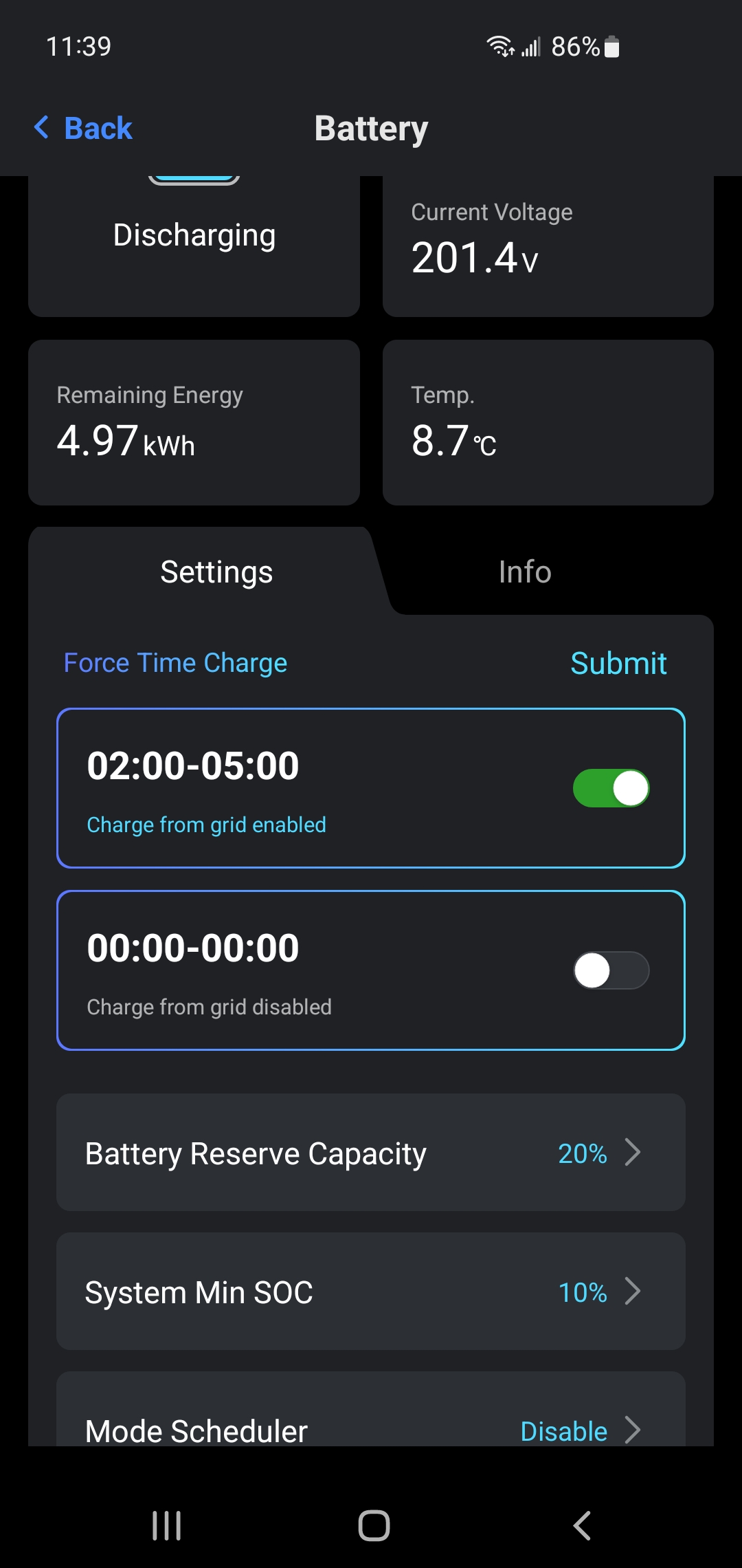 Also I have an iboost to heat the water and this has been coming on when the batteries are nowhere near full ( like 34%). The system was working fine in the summer months but something has happened recently which has caused an issue. I have just today built an insulated box around the batteries as I read that they don't recharge in freezing weather but the system still seems to have a problem. Any ideas anyone ? As far as I can see the system is on self use. One battery is set so it force charges from grid from 2-5am .