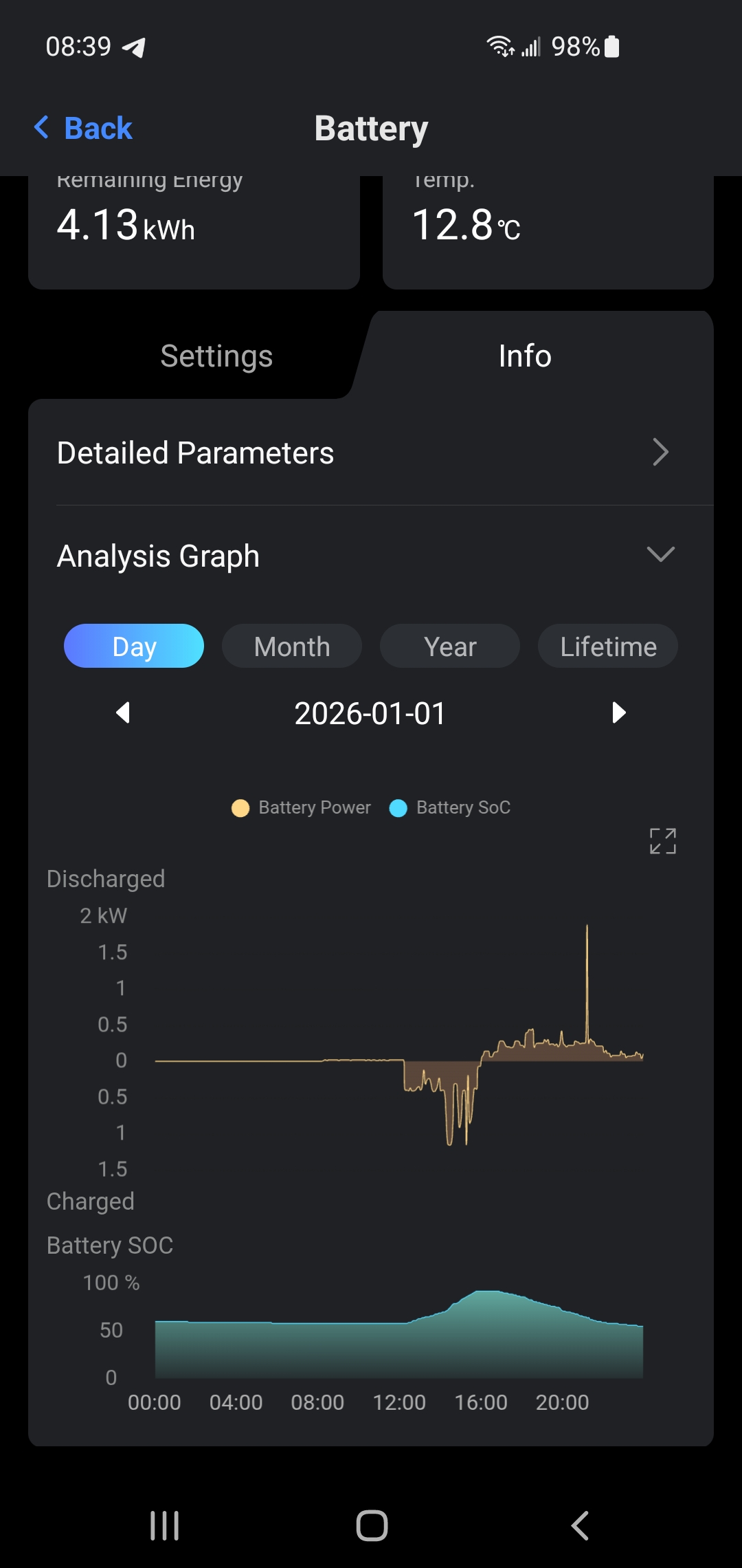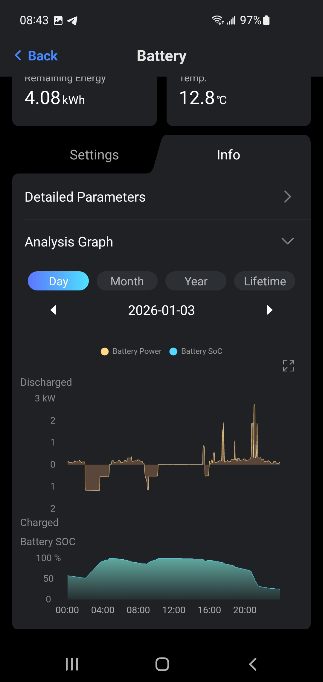 The first graph shows the batteries state when they are just outside hung on the back of our house (where the installers said they'd be fine ?!?) . Here they were getting to freezing point which meant they were not working properly. Not charging and actually discharging when they should be charging. This next shot is showing how much better the battery is performing after i insulated around it with 50mm celotex and added a low watt heater into the compartment. Bearing in mind the weather outside has stayed pretty constant (very cold) as you can see - the battery is working so much better. Charging quickly , holding charge and discharging correctly.