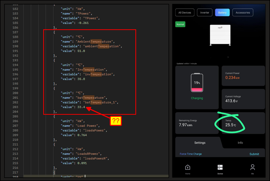 The temperature you see in the app is the lowest cell temperature, whereas batTemperature is the temperature at the BMS power junction and is usually 6-10C higher than the lowest cell - sadly despite our continued requests Fox have not added the lowest cell temperature to the OpenApi.