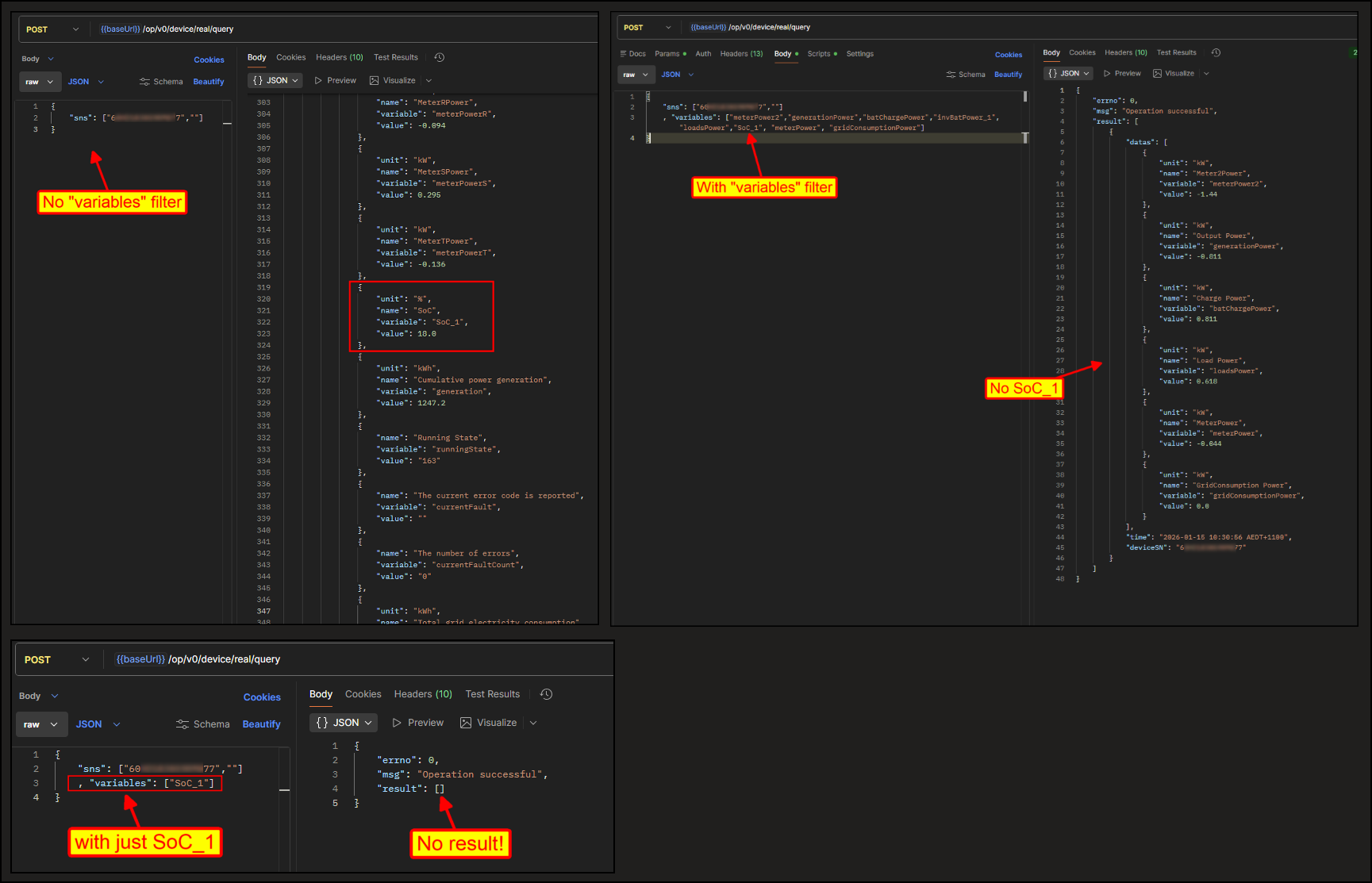 • The real/query endpoint doesn't seem to return Soc_1 variable when filtered