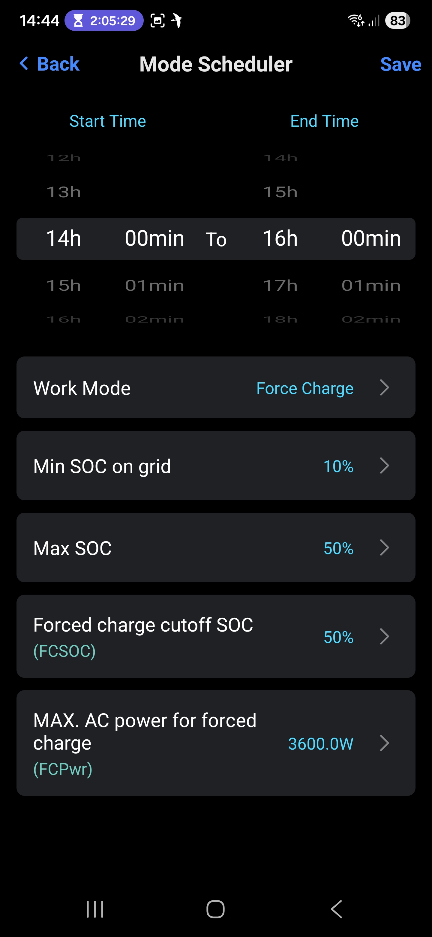 My schedule and usage are shown below. You can see that I've set the Max SOC and the Forced charge cutoff SOC to 50%, but even though the battery is at 57%, it's being charged by my solar panels, and the house is being charged by the grid, which is not what I want. I'd expect that once the battery met the 50% cutoff, then the house would be charged by a combination of solar panels and grid, until the end of the schedule, and then revert to battery use.