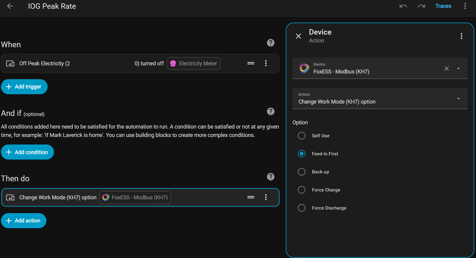 Next automation waits for the opposite, where Off peak turns off, changes mode to Self-use/Feed-in for daytime or after you have had a random IOG slot occur.