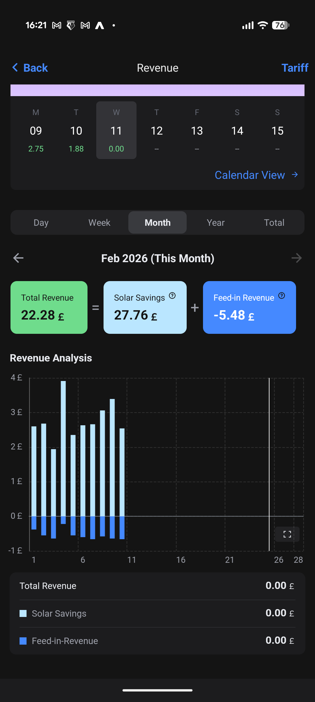 I think I've attached screenshots of my tariff settings screen and the revenue screen for this month to date...I don't understand how a feed in tariff can generate a negative value for Revenue....in fact I'm sure it can't. What am I misinterpreting?