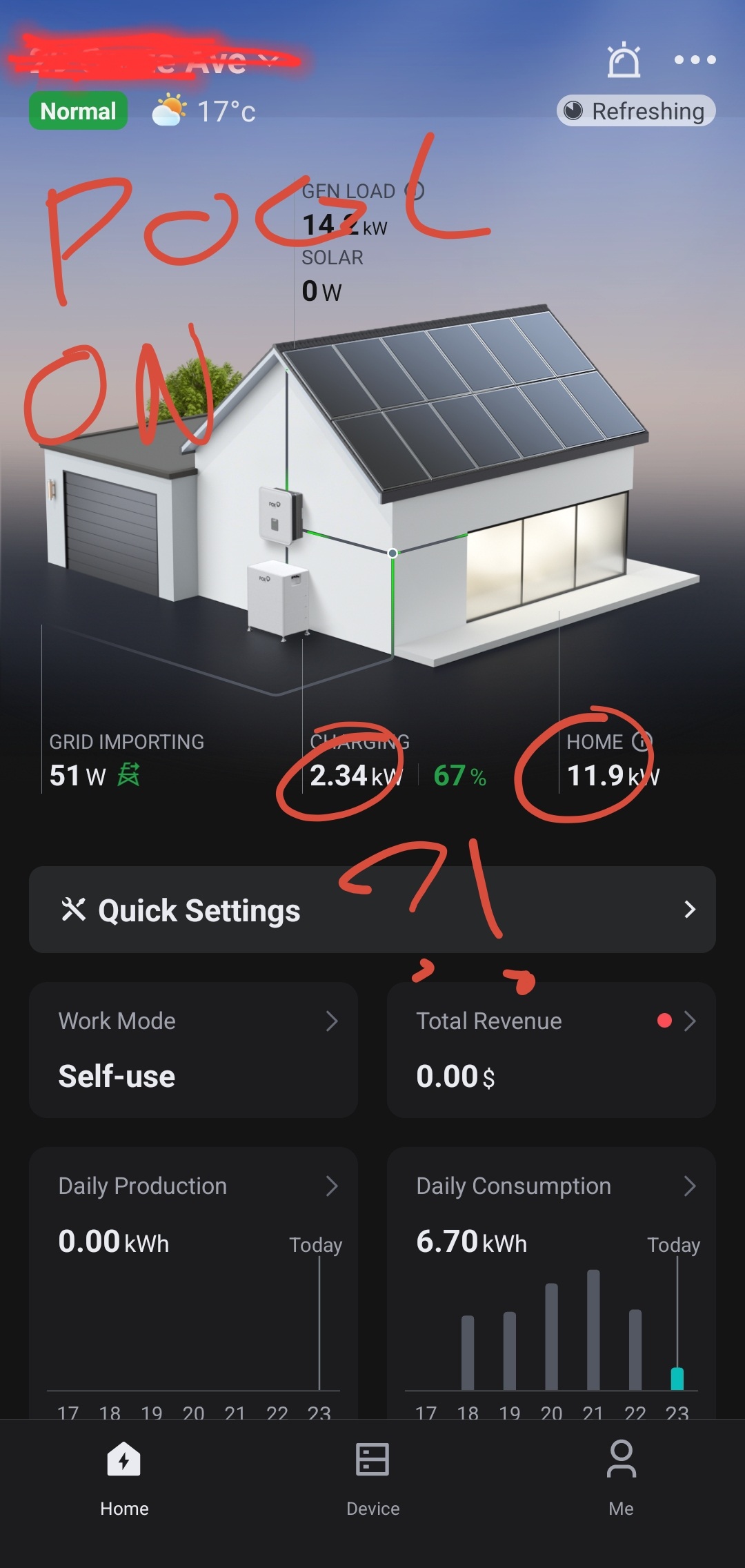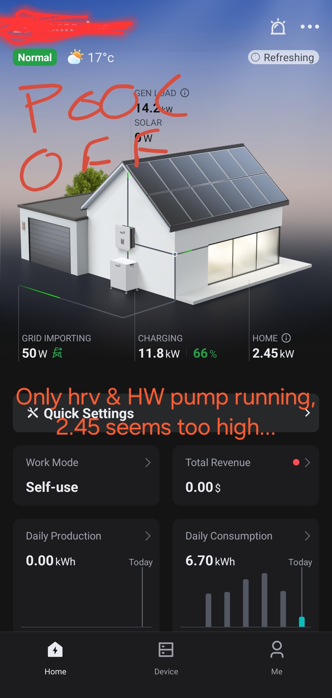 You can see - only just - that the Gen load is 14.2kW, but the home usage is showing 11.9kW, which is completely wrong for only the HRV, Pool pump+heater, and the HW compressor running at the time, about 100W + 6kW + 700W, nowhere near the ~12kW the app is showing. And that then means - somehow - that only 2.34kW is charging the battery, terrible rate.