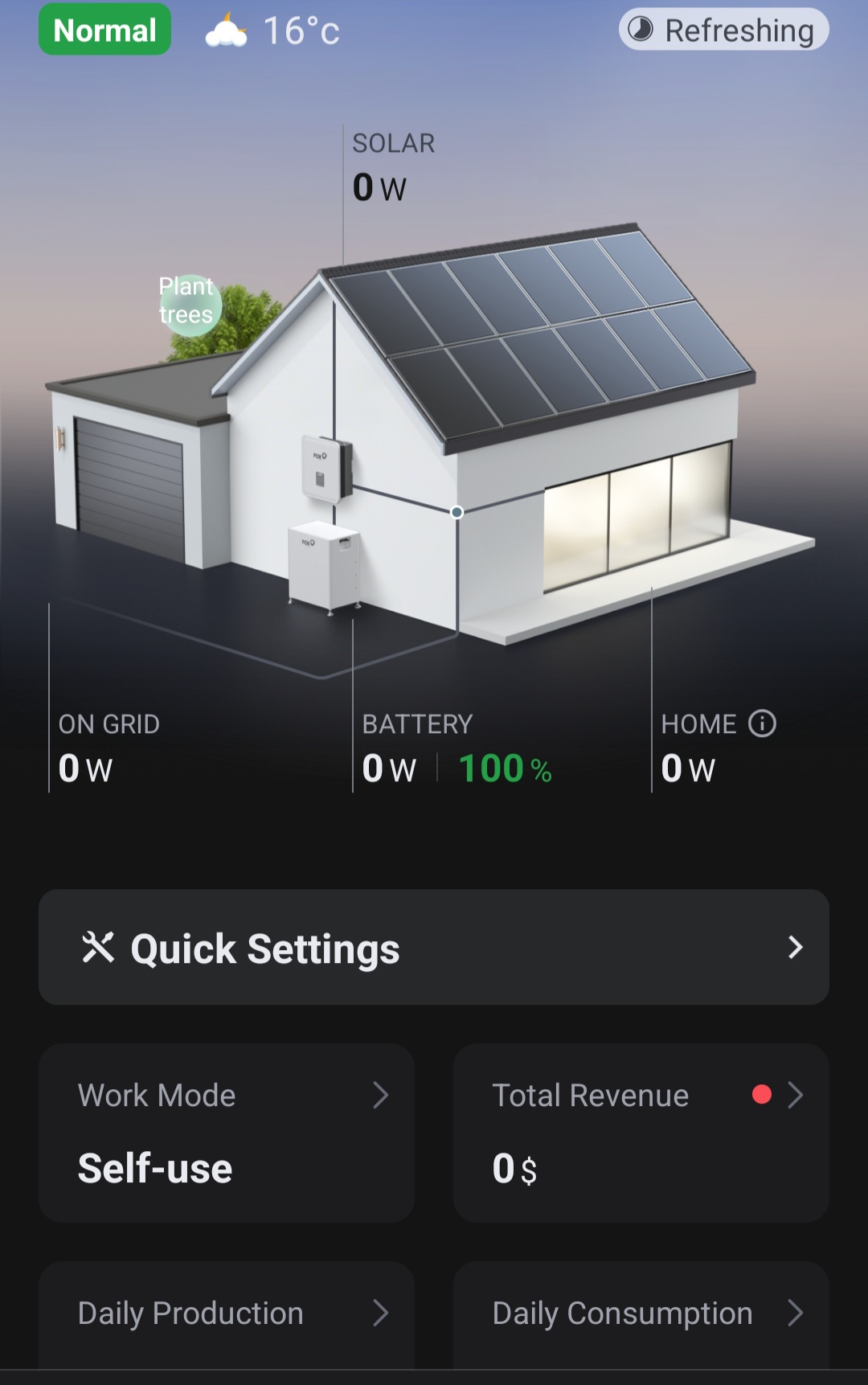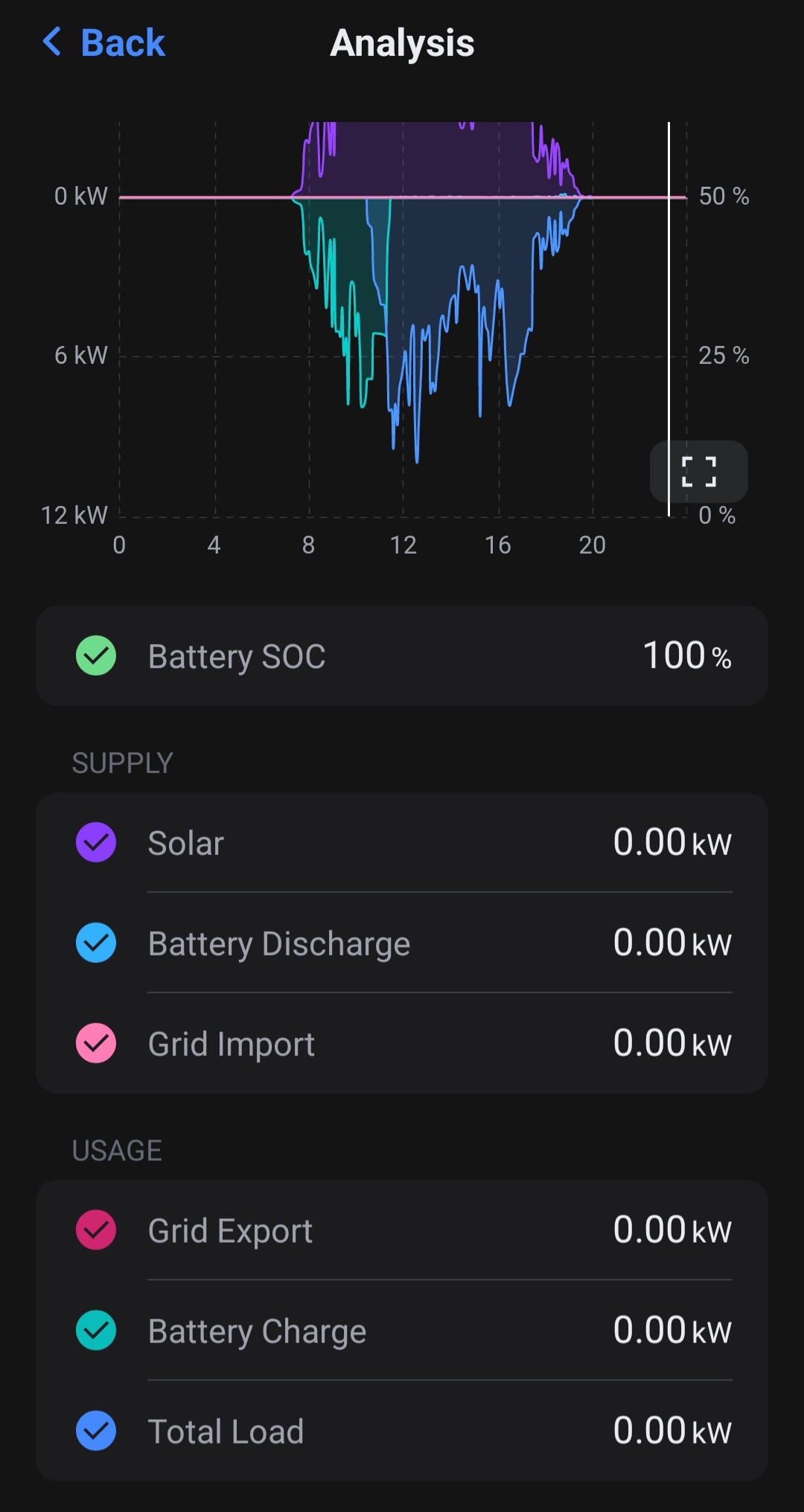 -at end of day everything is 0 with battery fully charged 100%. Now home with several appliances on and still registering 0.