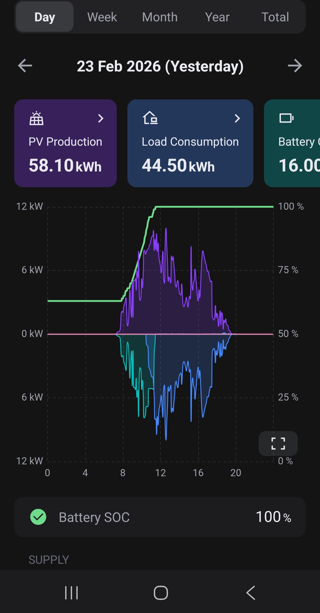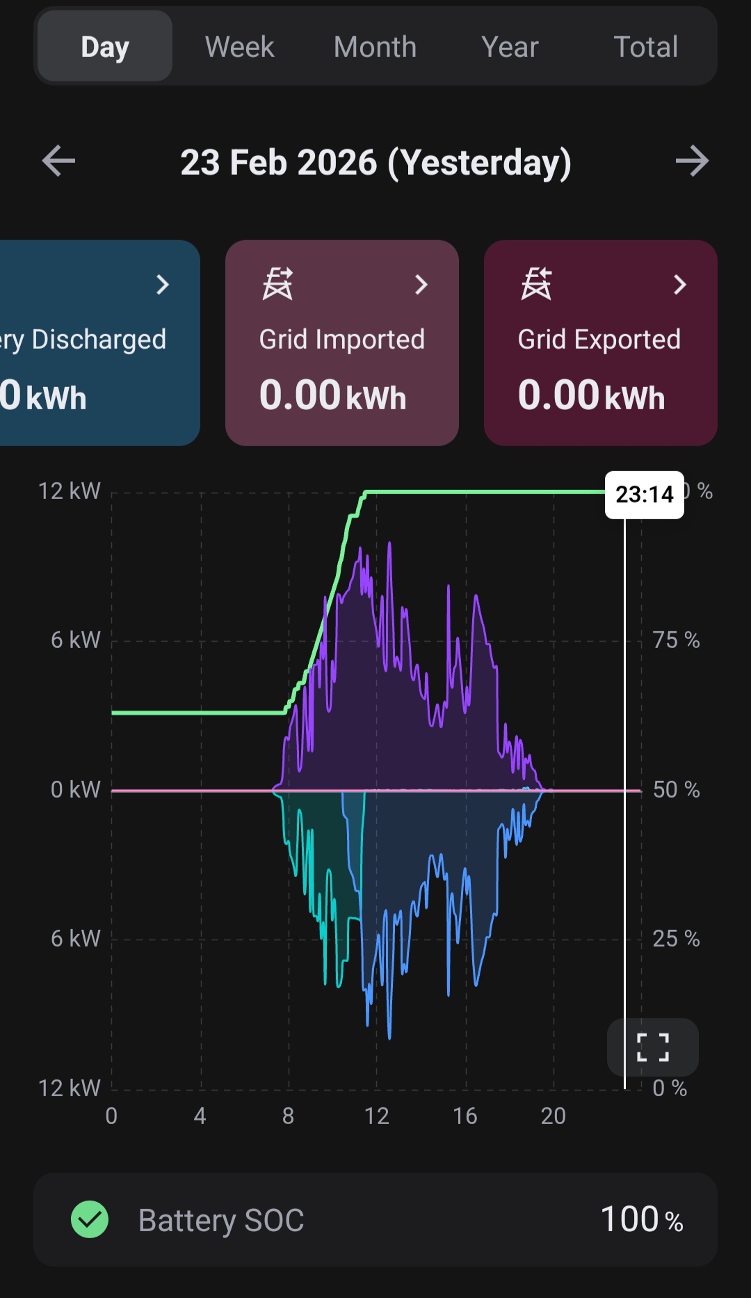 - through out the day my solar seems to be generating to charge battery and home usage (approx 5kw, again nothing on in house) 0 on grid.