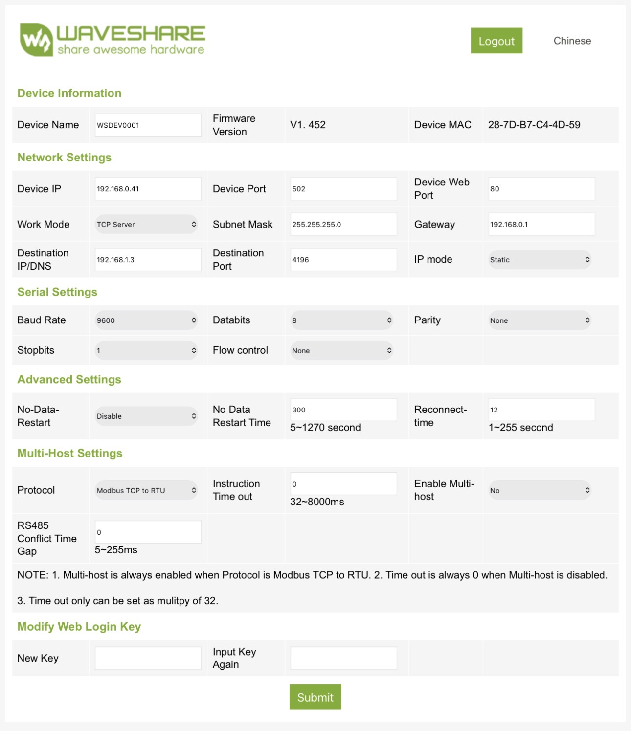 It may be worth you upgrading the waveshare firmware, located at : https://www.waveshare.com/wiki/RS485_TO ... s_firmware