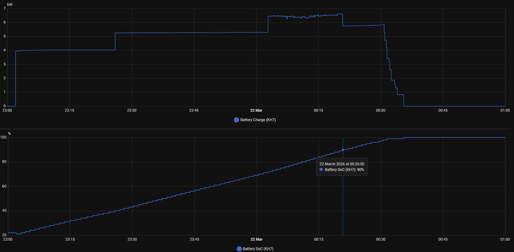 My charge cycles are run by home assistant, It reads the current rate from Octopus. If it's 7p then I charge the batteries. That means thay charge during the day and after 23.30 as well.