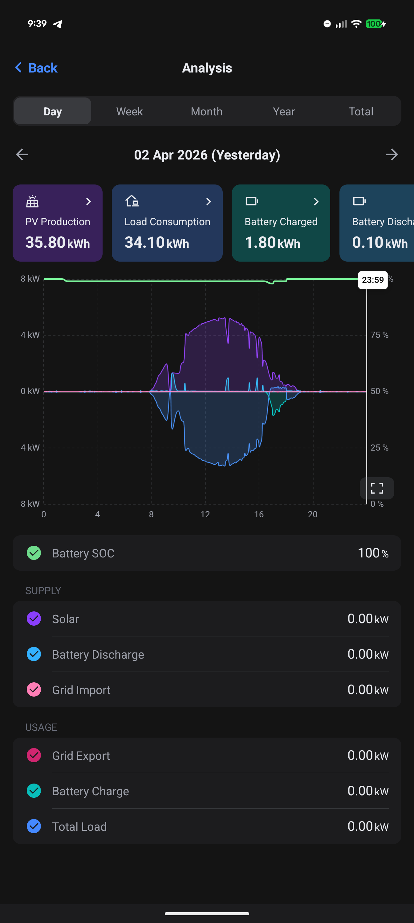 At a glance, the battery hasn't discharged once (other than small amounts) over 3 days, despite our house definitely using power when we're no longer generating solar. In addition to this the house load seems to just follow the solar panel generation - during the day it shows us using 4-5kwh, and at night it shows us using 0.