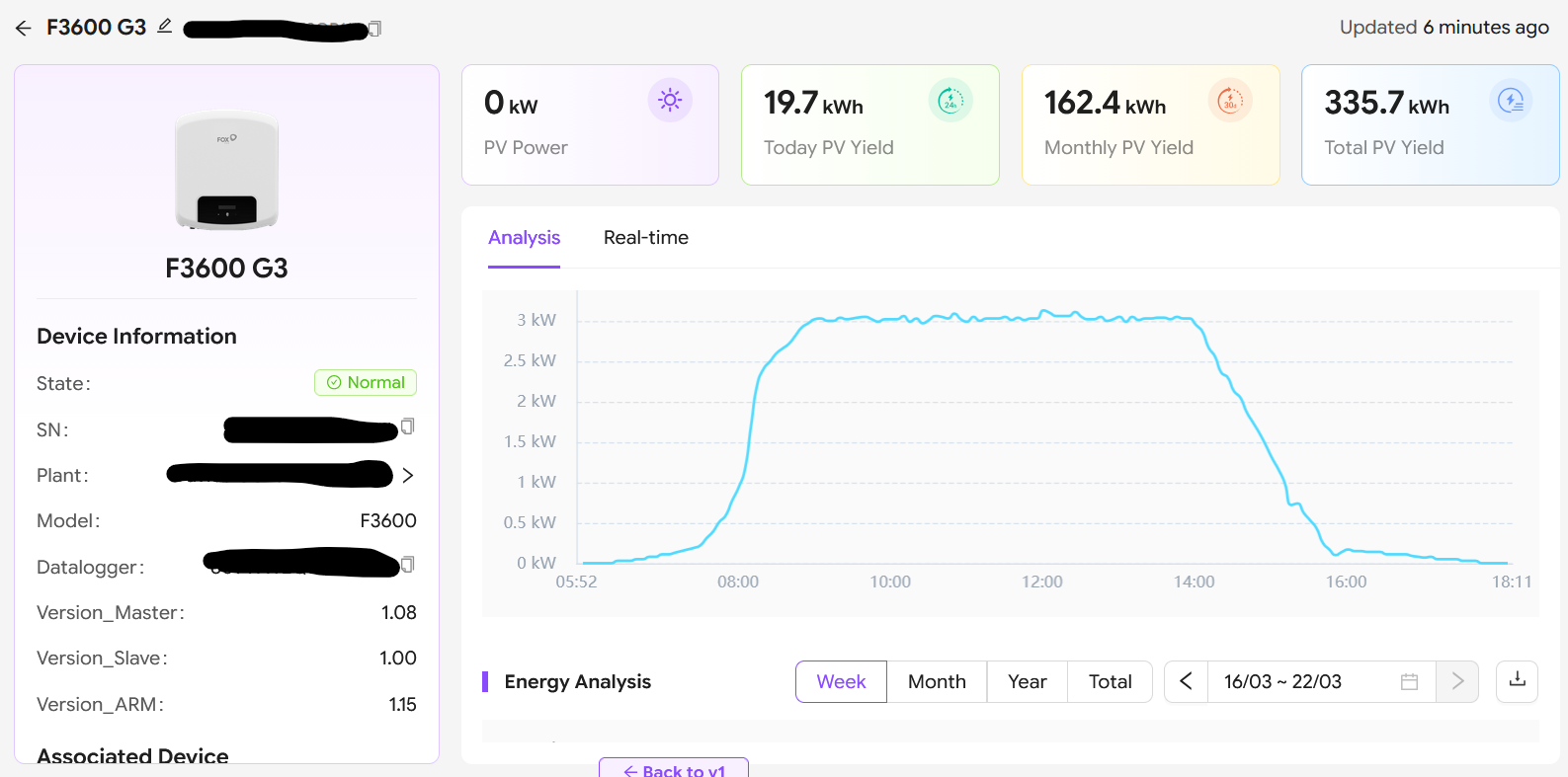 Have moved the F3600 G3 to the workshop string where the 6 x 640w panels are split into 2 strings 3 in each.