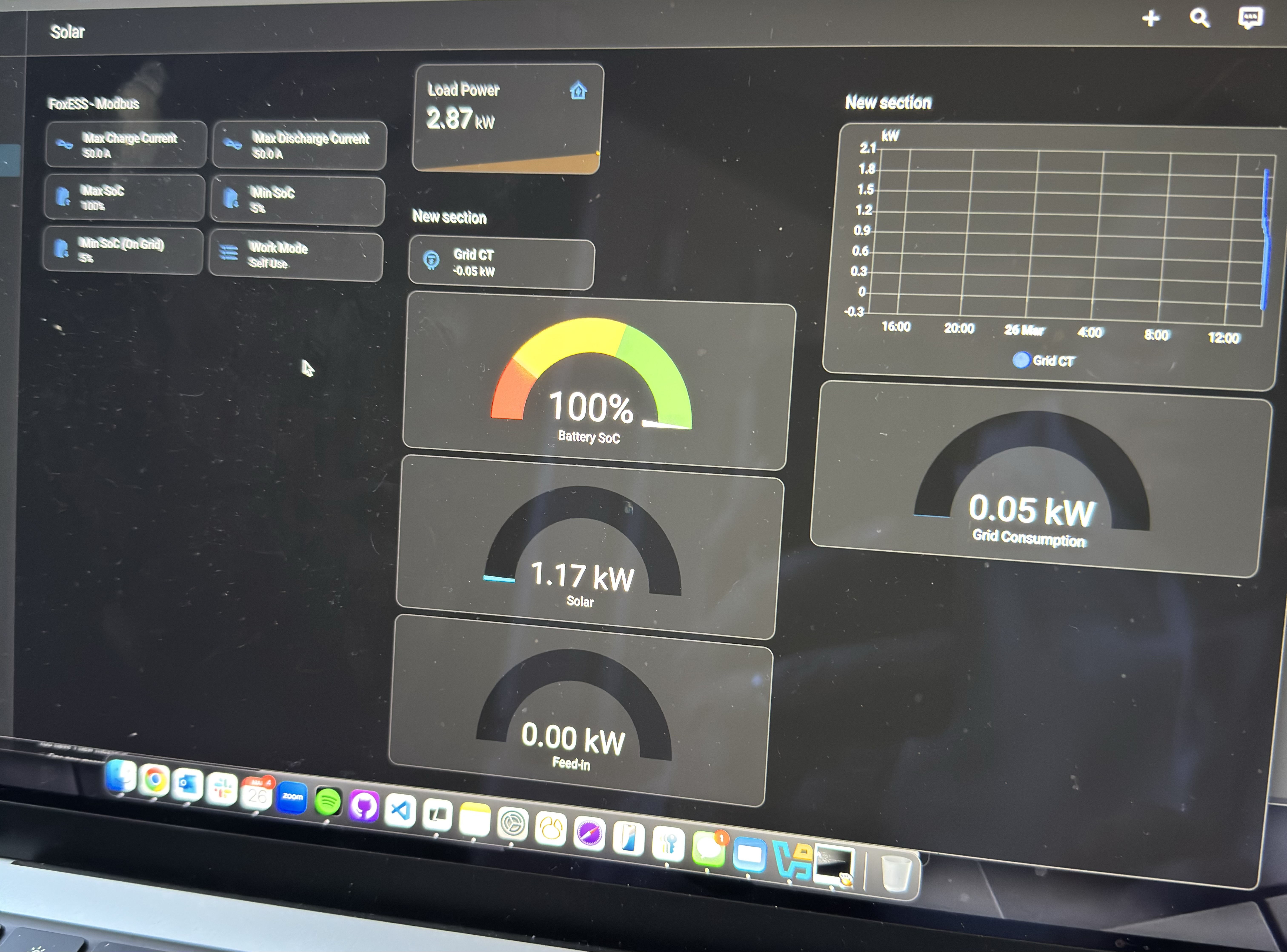Depending which order your battery and Ohme are connected and where the Fox current tap is it might see the charger load. 6kW at 240V is 25A so if both were charging that could be 50A plus the house load, but I'm not aware the Fox monitors the total load. Quick Settings says mine is set at 15000W for Import and Export Limits which would be 62.5A but the unit isn't capable of that level anyway!JamesBranson wrote: ↑Wed Mar 25, 2026 10:15 pm They also said that they think my 60A fuse is a factor, but I’m not sure how that works. My Ohme EV charger works at 6kW just fine.