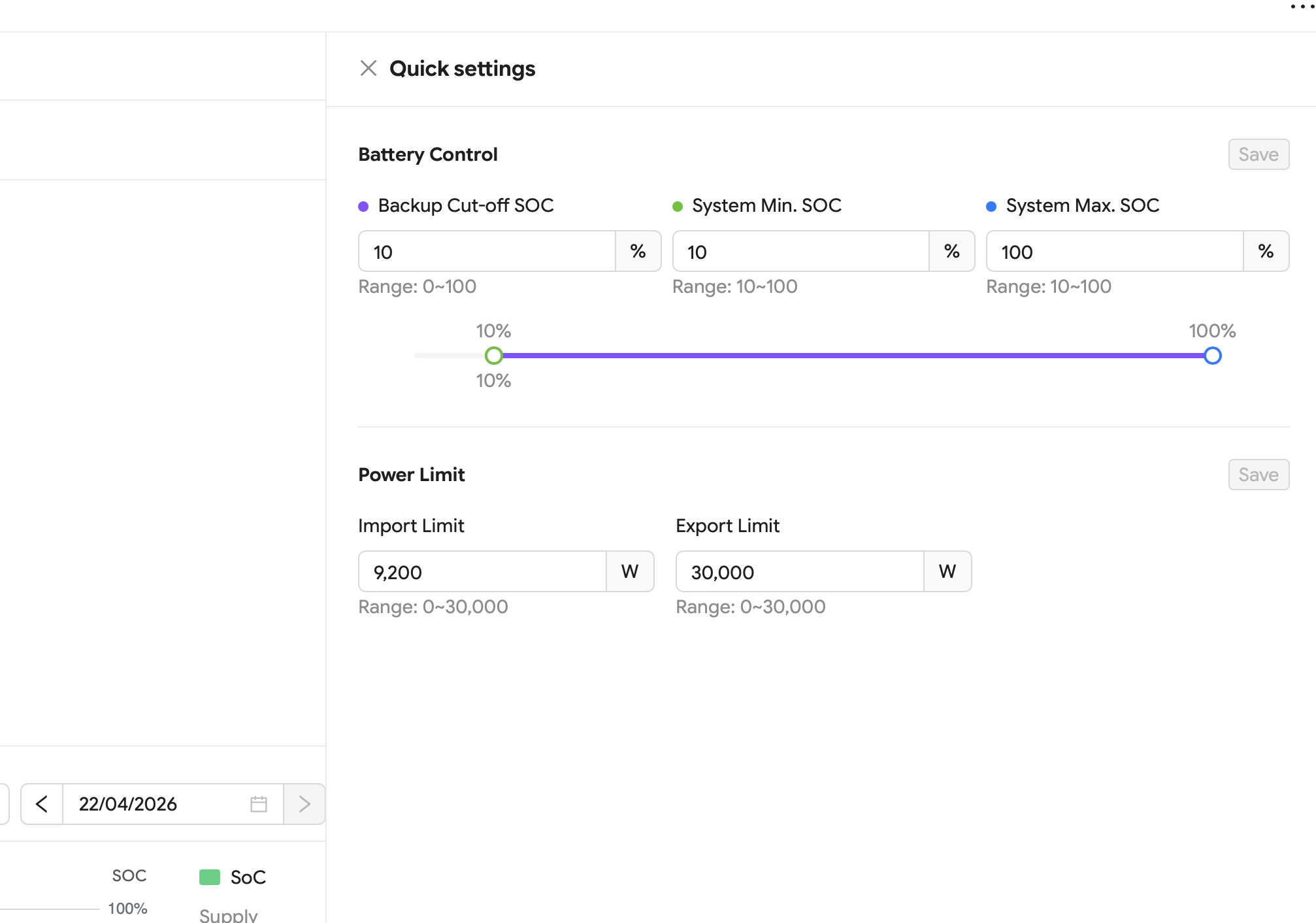 If you have schedules enabled you need to adjust the min/max in the schedules otherwise you get that error. If you disable schedule mode you'll be able to update those settings but they don't effect schedules at all.AlanHodson wrote: ↑Thu Mar 05, 2026 8:12 am After this information I changed my max soc to 90 no problem but