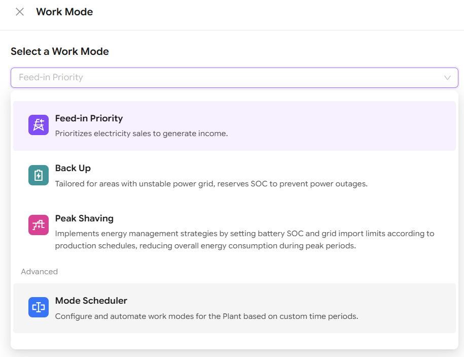 On the right side of the page, just under your plant name, there is 'Work Mode' and you can press the 'Details' button to get to the 'Mode Scheduler' under 'Advanced'.