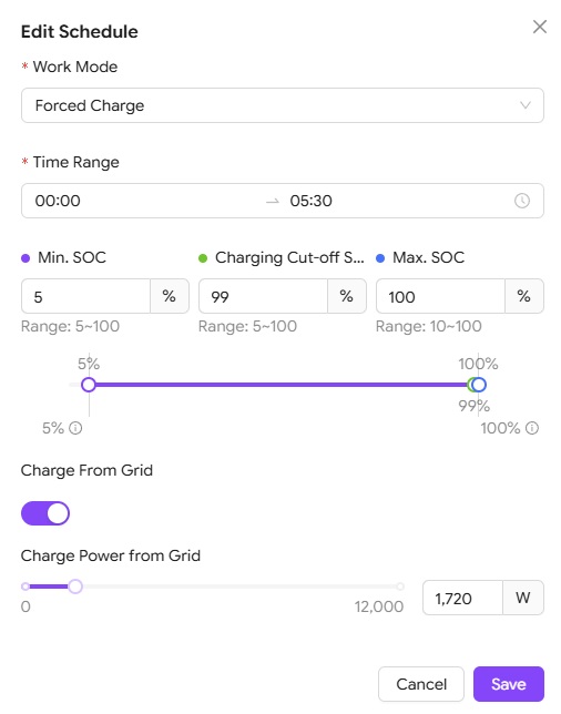 If I change the remaining time work mode to forced charge it starts right away, so it’s just ignoring my schedule. Brilliant.