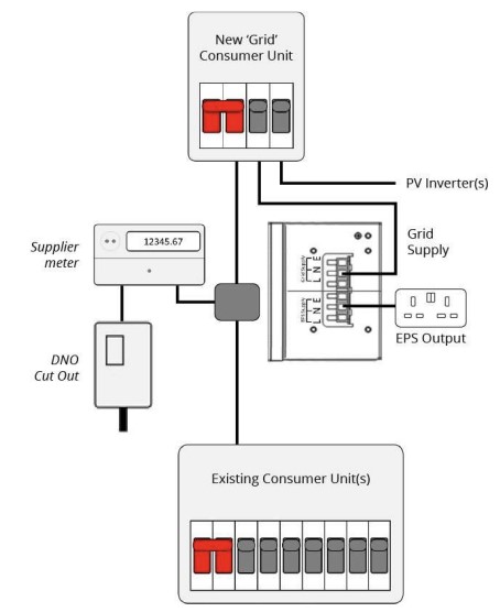 This is where the EPS output is routed into your main consumer unit. In a power cut, your entire home will be powered via the EPS.