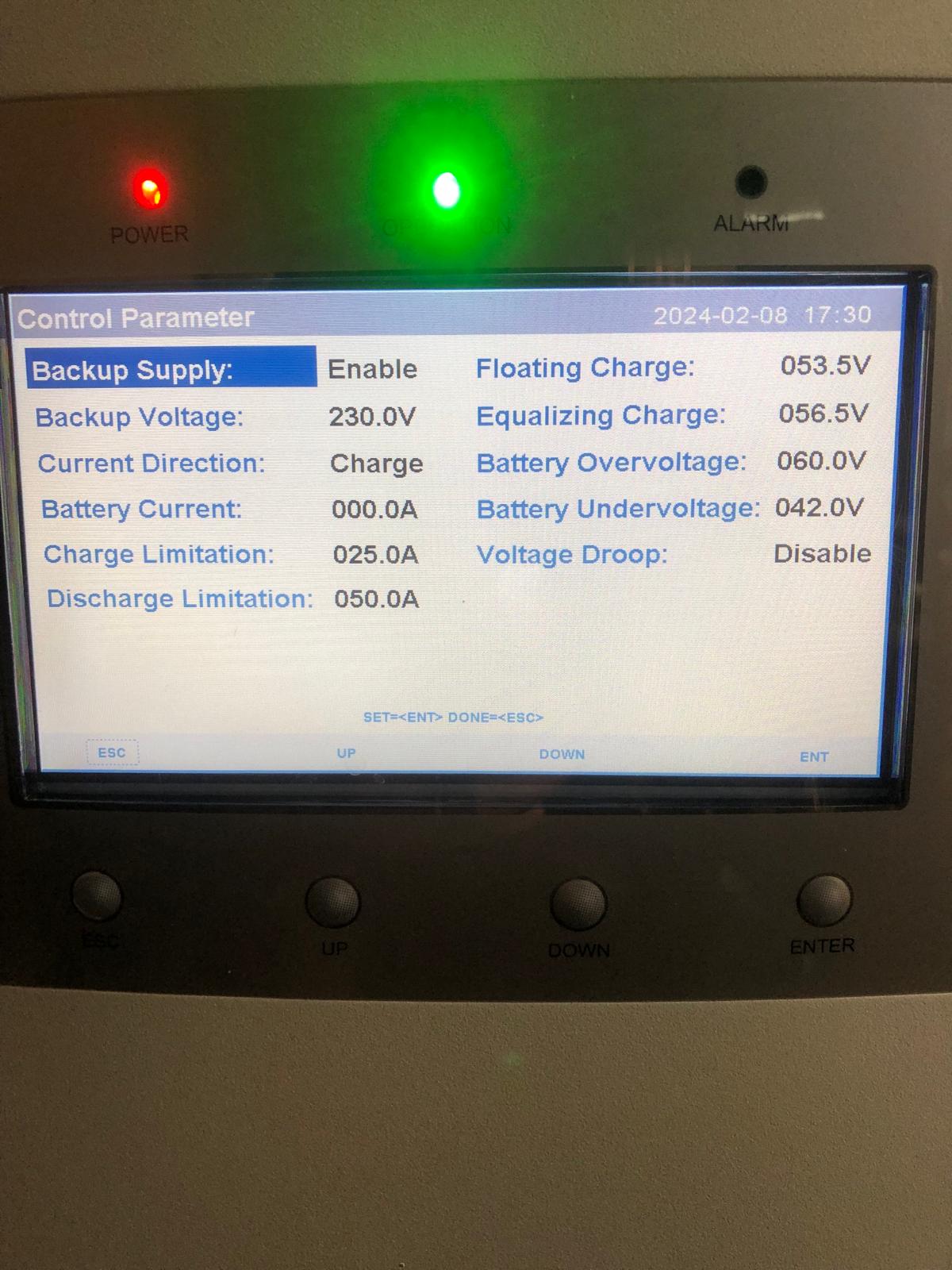 I have attached the tech sheet for my battery and a picture of the current settings on the inverted (which I have not changed since original install)