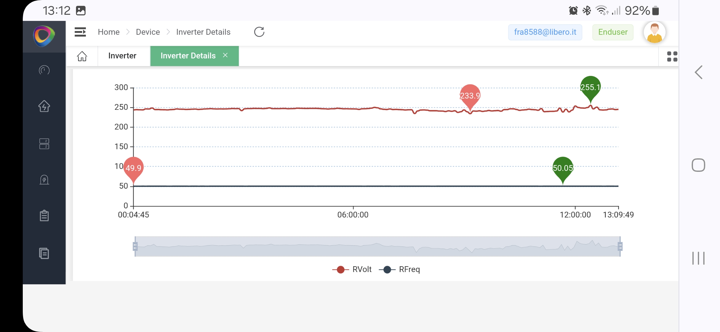 sorry for the many posts here I put the rfreq and rvolt graph and calculate that from around 12:00 I had 6 errors avg set to 253 (done yesterday because otherwise it would give me frequency error while I was using the batteries and I know it's not related but by setting it to 253 it doesn't give me a frequency error) now I put it back to 257 as you told me yesterday and set the DAC lower than 47.50hz