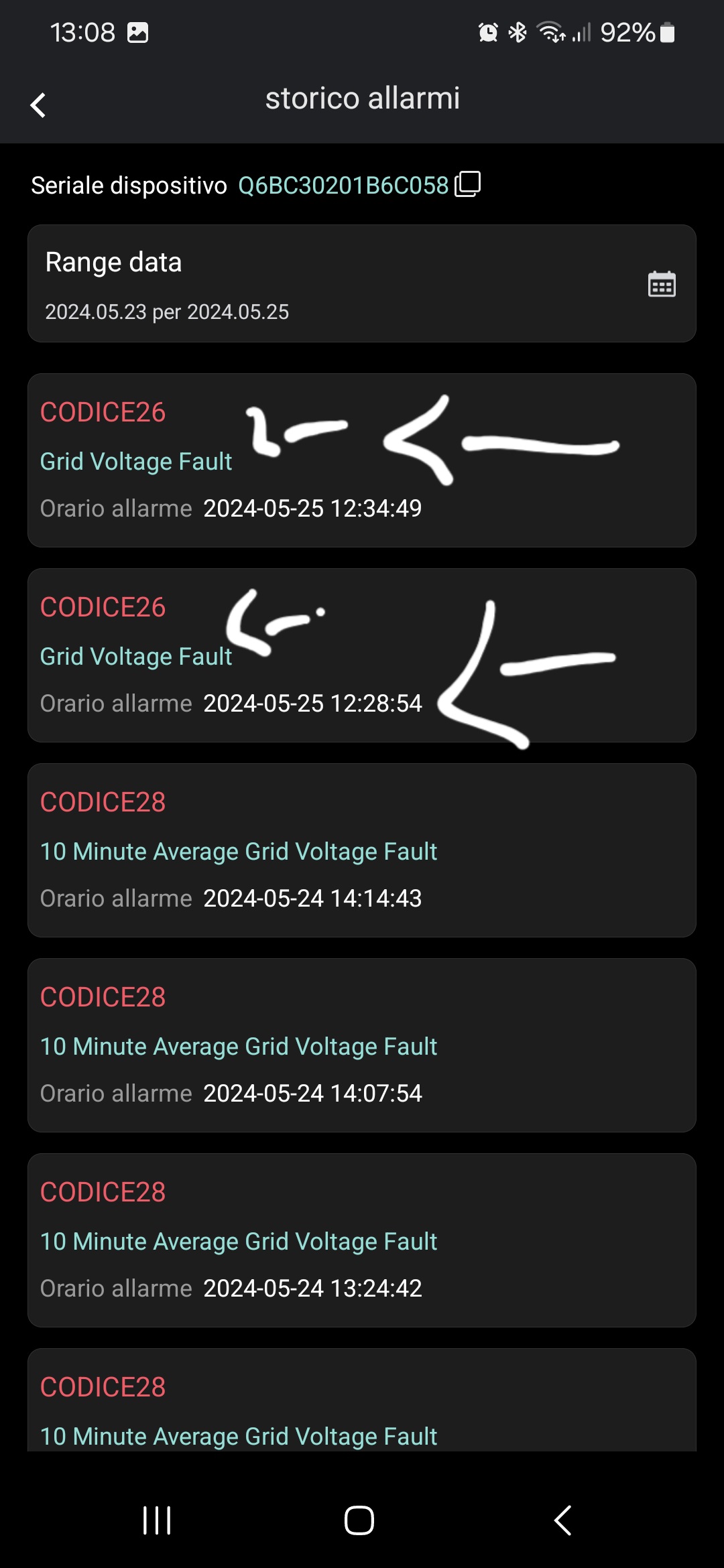 here I am. so I get the usual grid voltage fault errors punctually when I enter a lot. at this point I really don't know. I'll leave it like this. cheerful screen