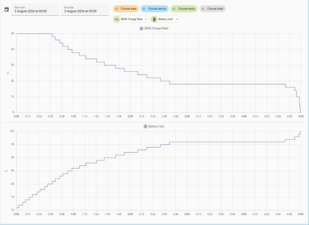 But if you have set a maximum DC charge current in the inverter settings then it will not be able to charge any higher than that irrespective of what the BMS would allow.