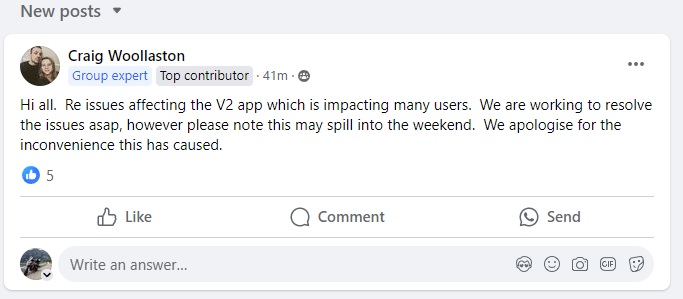 The V2 app has been having problems on and off today - Fox appear to be working on the servers.