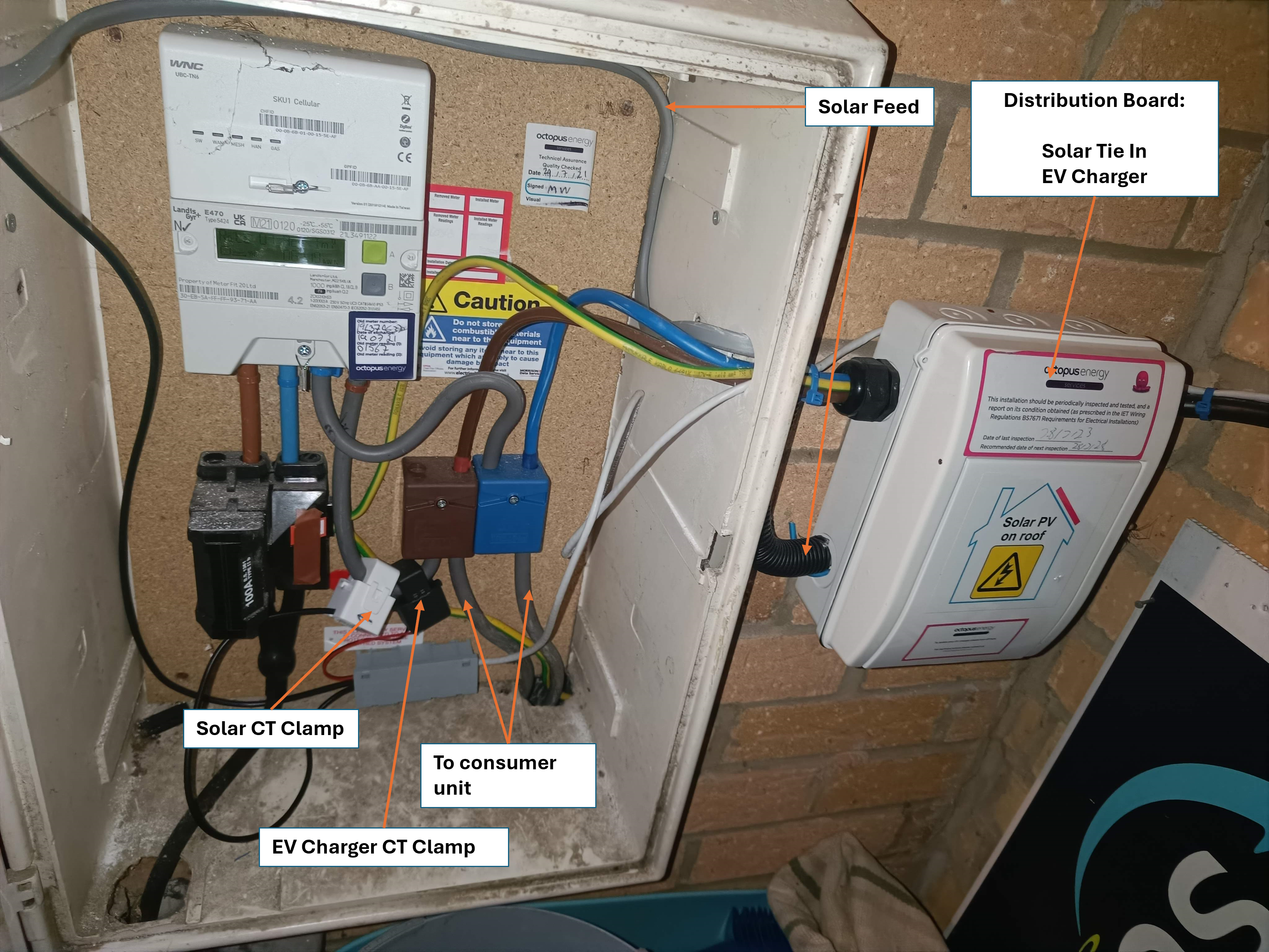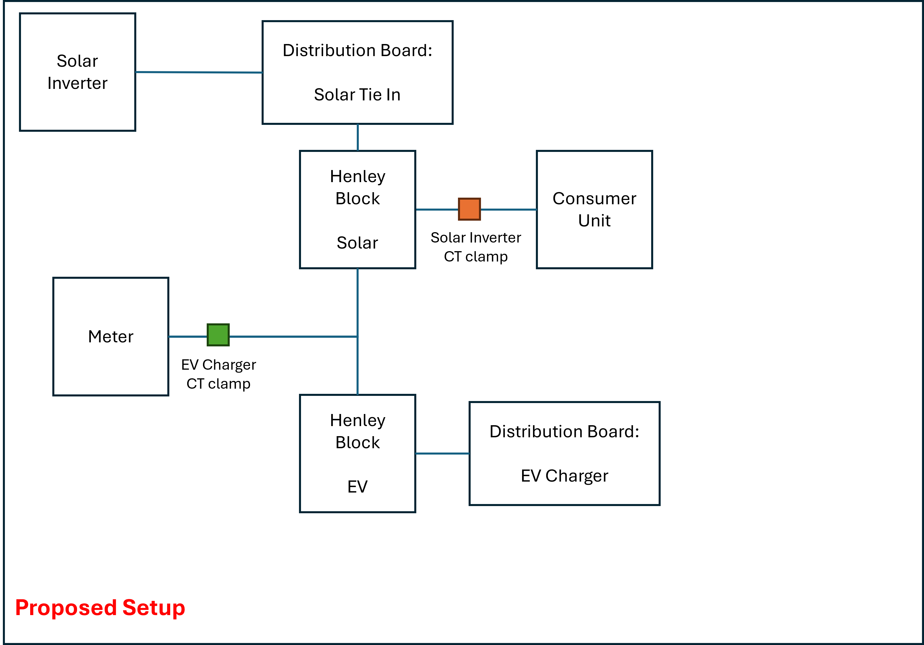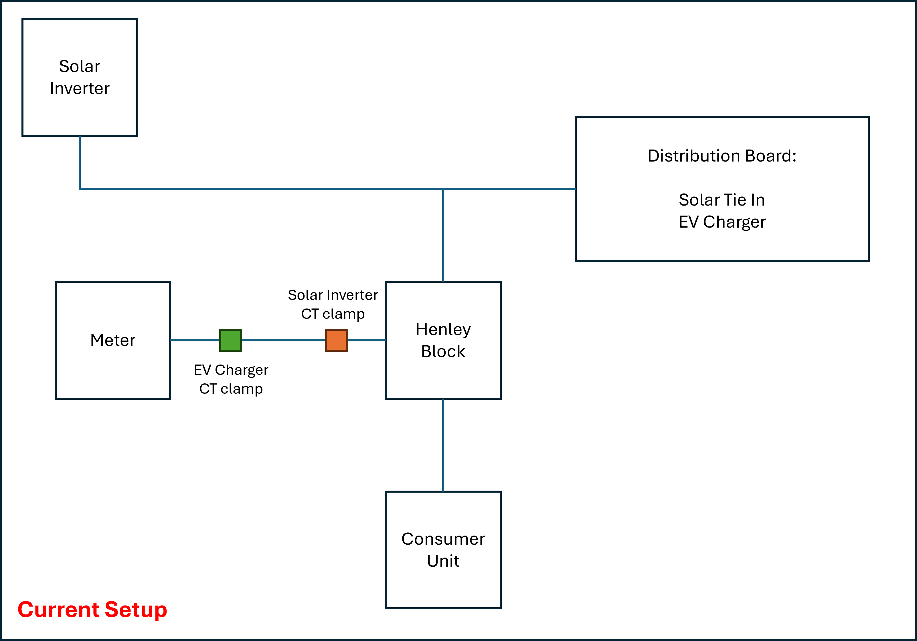 Currently my solar is tied into the grid in the same distribution box as my charger is connected, sharing the cables from a henley block between the meter and consumer unit. Where the solar CT clamp is currently, the inverter sees the EV charger current resulting in my house battery being depleted.