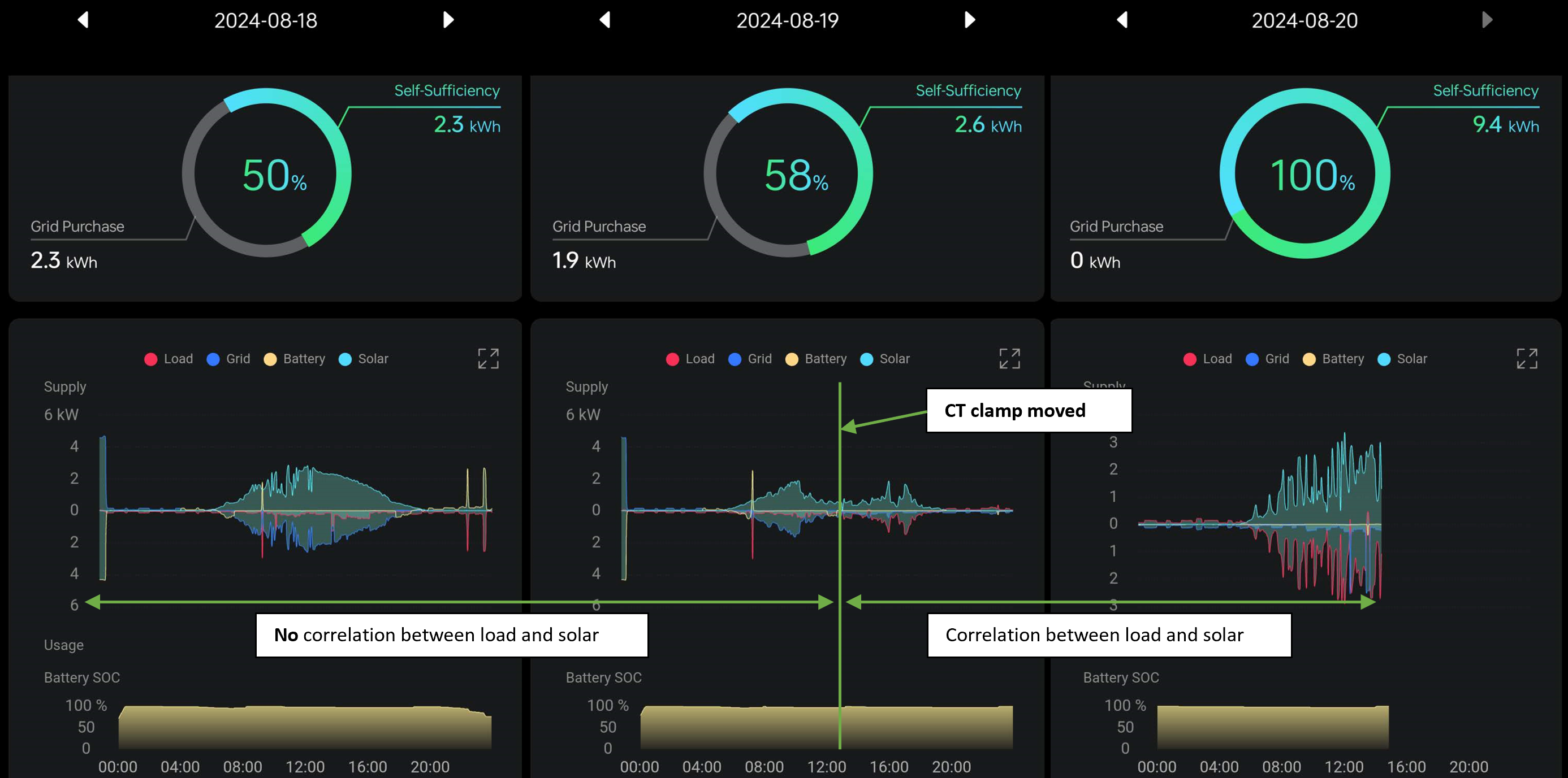 The solar installer suggested moving the solar CT clamp to the leg between the henley block and the consumer unit but that reported an inverse of the solar generated and my battery power wasn't used for anything.