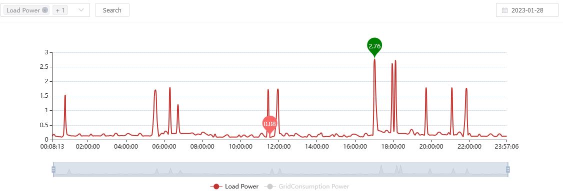 Here is the Load graph for Sat. I have added for comparison that graph along with the Grid Consumption which follows it very closely - the latter is less the 0.12kW of battery supply apart from when the sun is shining. I can confirm these numbers relate well to the figures I see on my smart meter IHD of instant reporting of grid consumption.