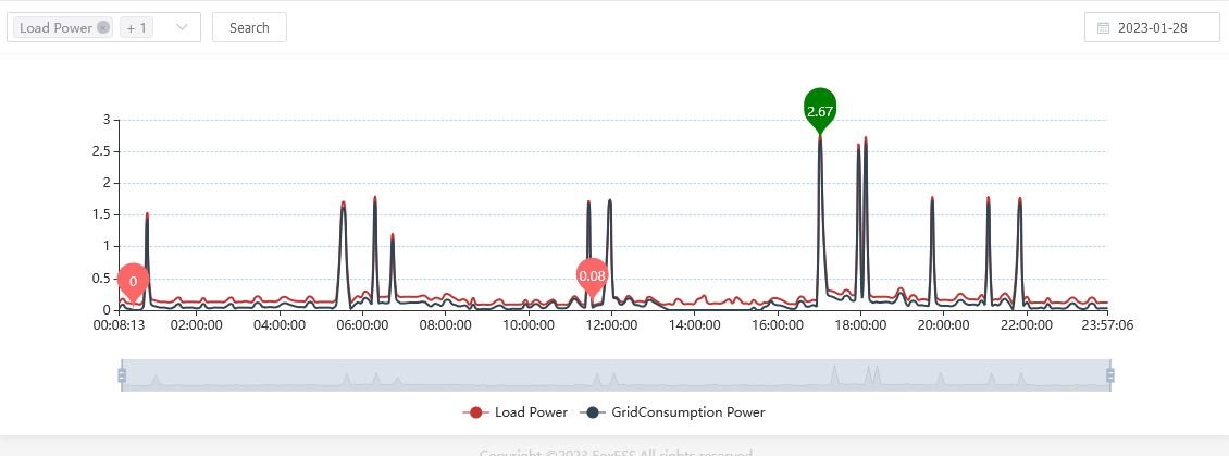 FYI I know about the regular demand 1.7kW peaks throughout the day - they come mostly from our instant boiling water unit which heats up for about 30secs approx every 40 mins or so - of course with the strange snapshot reporting of Fox, the chances of it being spotted depends on whether the snapshots are or are not in sync.