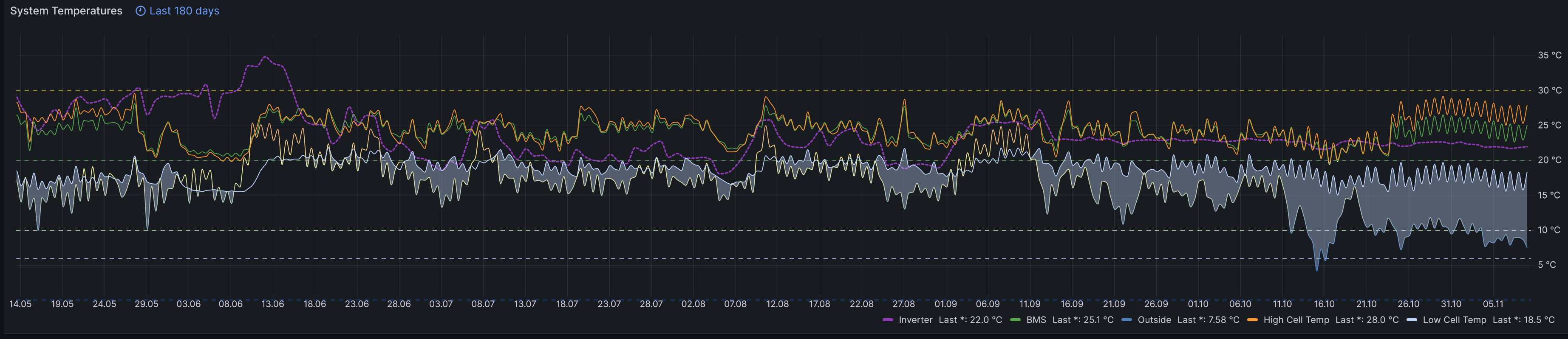 I have a feeling that the cold will still end up de-rating the batteries this winter as the lower packs will get a lot cooler than the upper ones, so I will probably look into some trace heating for the lower part of the enclosure, and possibly a fan to stir the air in there and equalise the temps a bit more.
