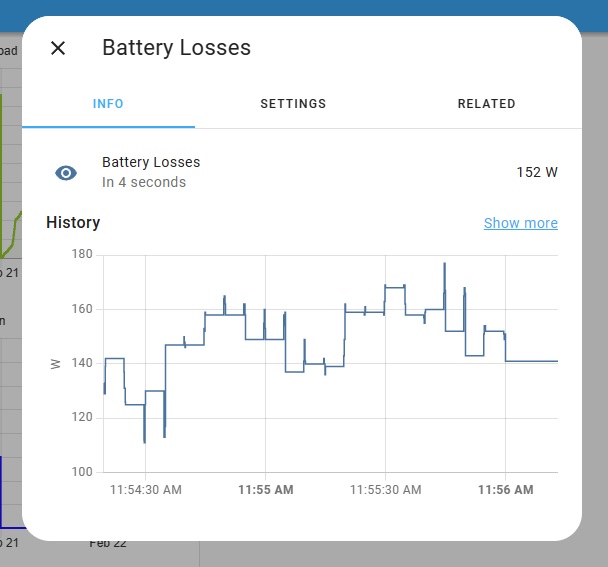 I use a home assistant that calculates the near real time losses at any point in time, this includes the 60~70W the inverter needs to stay operational which it takes these from the DC side (battery/solar), not the AC output - this is the current graph with some solar coming in as well