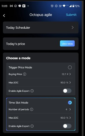 Hello. I am on the Octopus Agile tariff and use the Fox ESS app to automatically set charging according to 'Time Slot Mode' where it will automatically select the cheapest periods to charge.