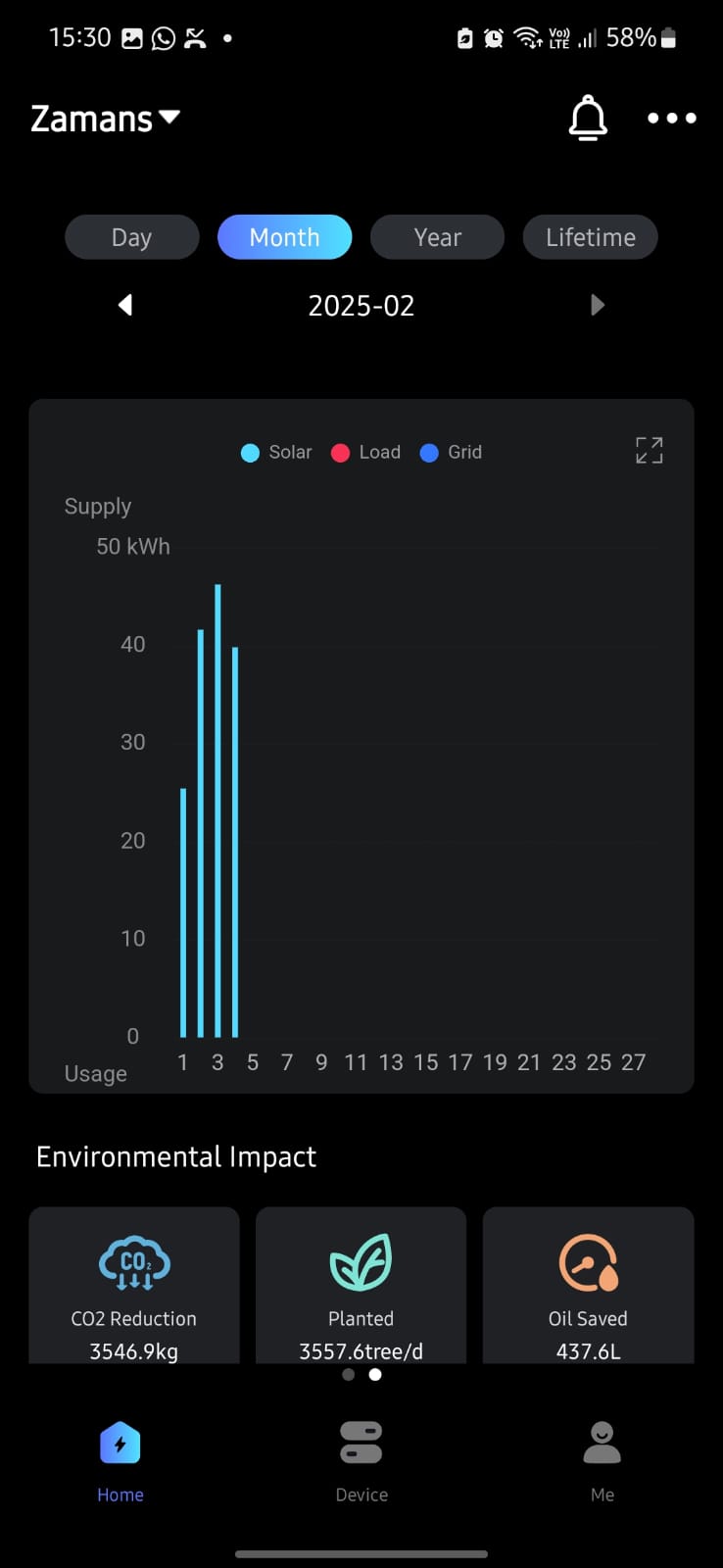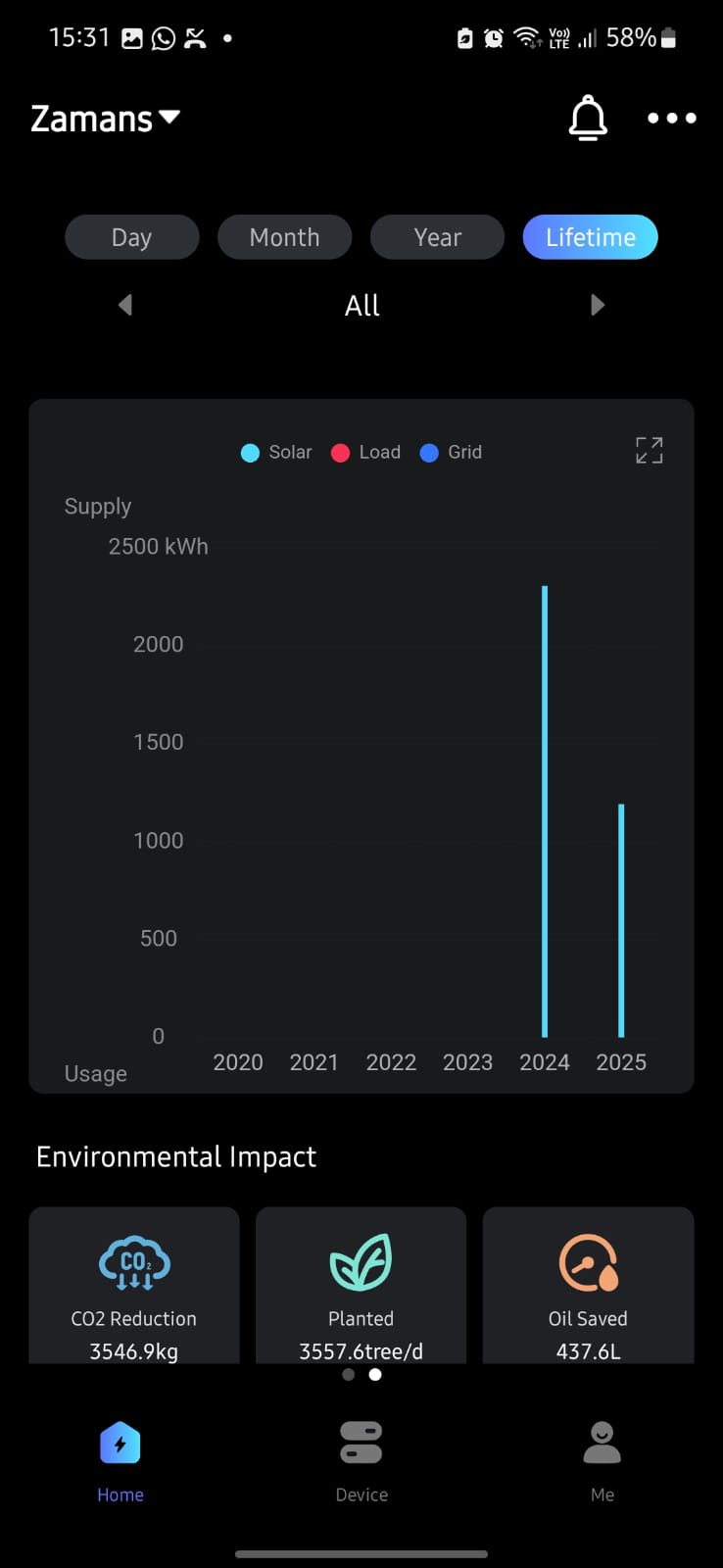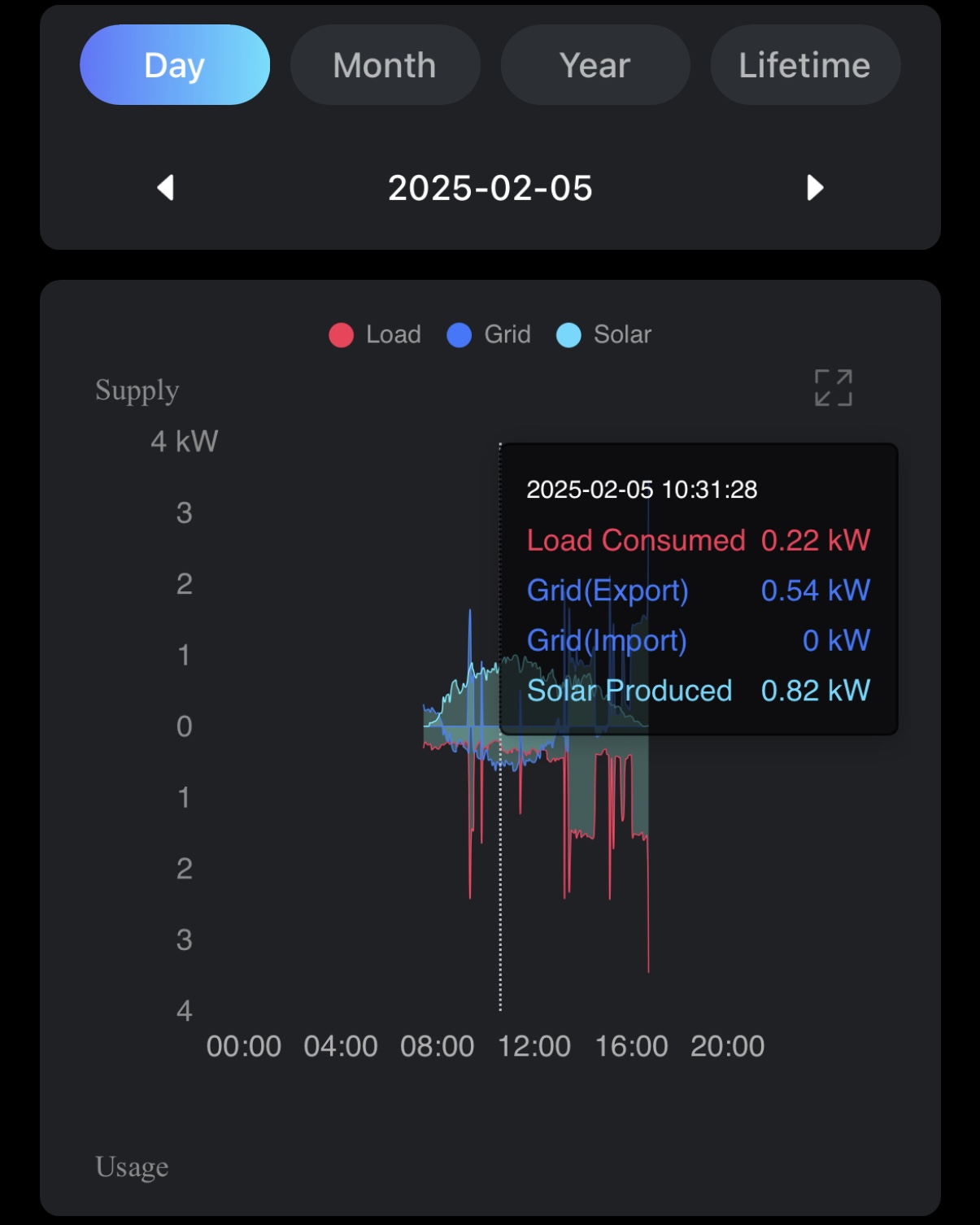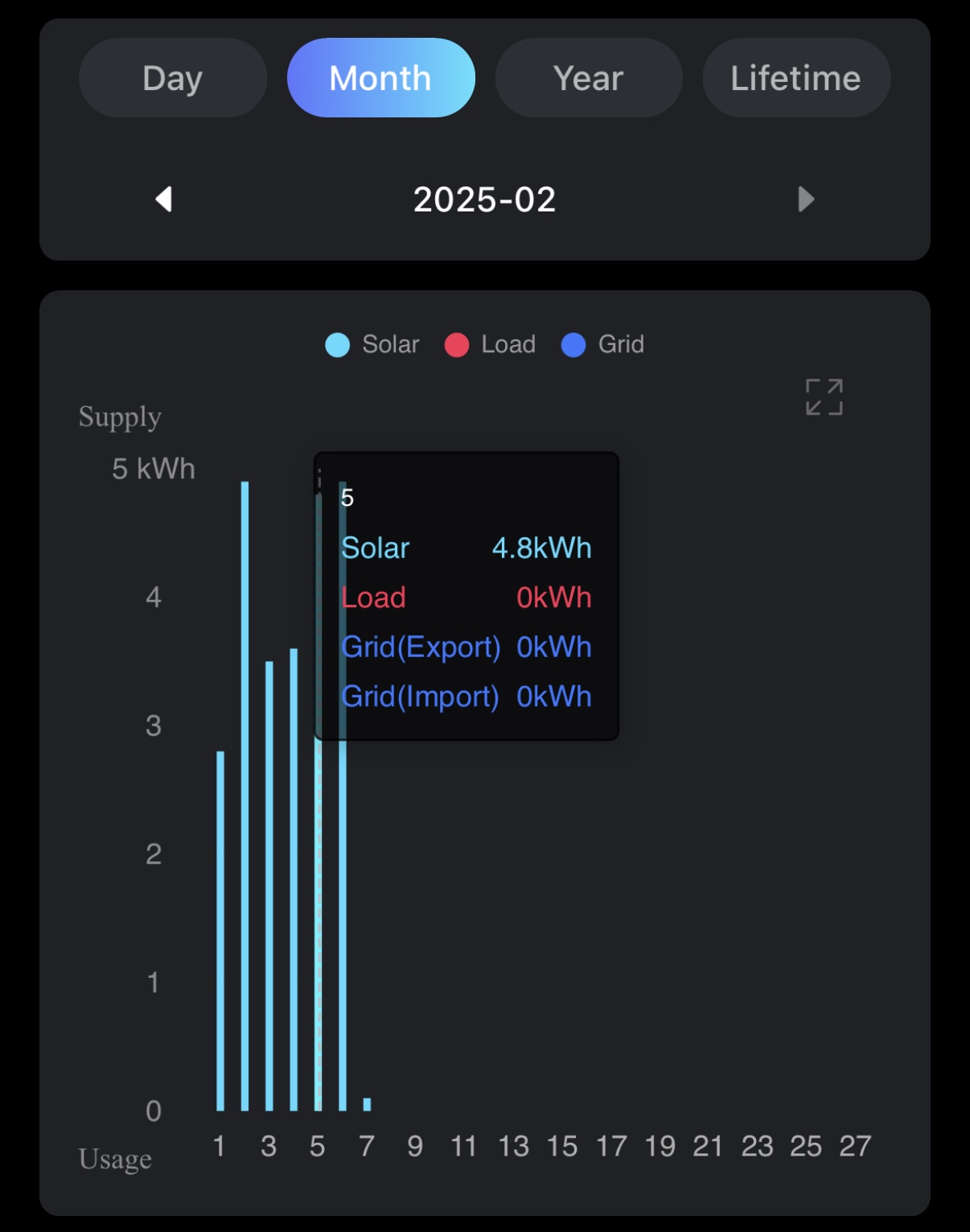 In the app I find all metrics tracked for the daily section in the data screen, with PV generation, Load and Grid export/import. However, the same data values are not aggregated and displayed in the month, year and lifetime sections/graphs. I have attached relevant screenshots from the app, the app shows filters for PV, Load and Grid data points but they are not available. I have contacted my installers but could not figure out what the reason could be.