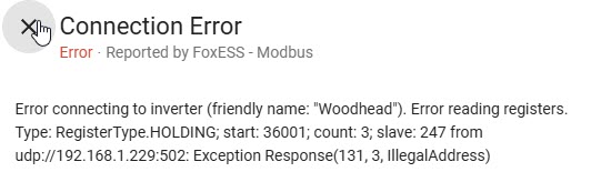 Error connecting to inverter (friendly name: "Woodhead"). Error reading registers.
