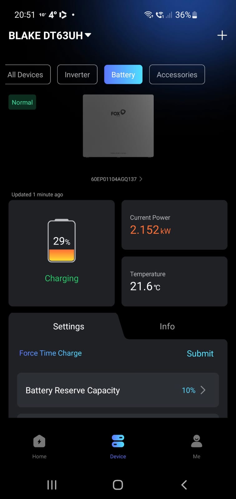 Does anyone have any experience with this problem: We recently had solar panels and a Fox battery installed. When there is a high load, the Fox battery starts to charge off the grid, even though forced charging is off (disabled via both the "Force Time Charge" slider on the Device tab; and also the "Enable charge from grid slider" on the Edit Charging Time screen.) Initially it seemed that plugging in our EV to charge triggered this occurrence. However, other high draw appliances such as the dishwasher also triggers it. In all cases, the common denominator is that the load displayed on the Fox app goes negative.