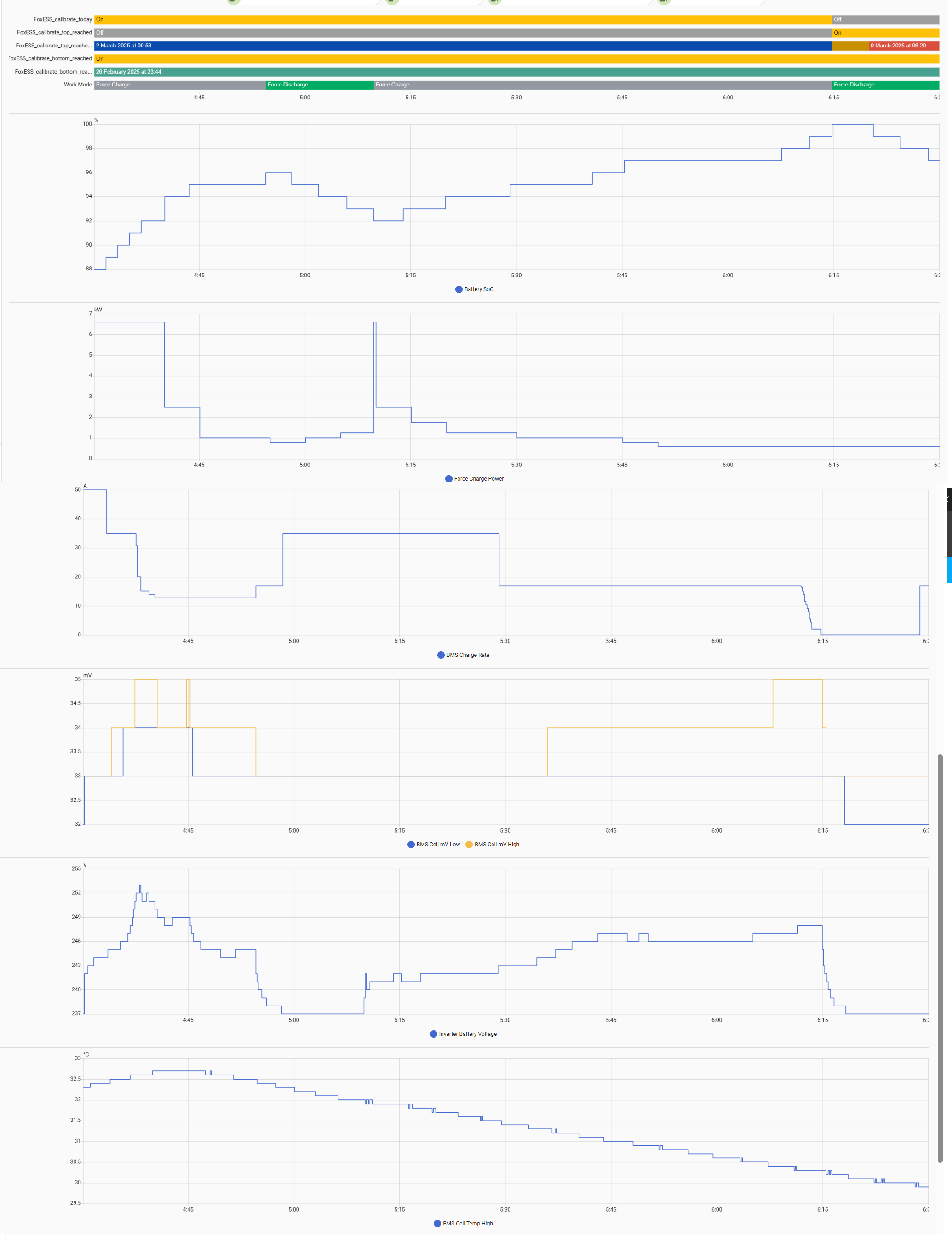 Here's the result of my calibration automation - I got brave and set it to 100%, and it reached it OK. This is with top calibration interval at 7 days, bottom calibration interval 28 days, charge current 2.7A via number.force_charge_power (600W on an EC4300-H4) >= 97% SoC. I guess the previous time when it got stuck at 99% was because the battery was cold (probably around 6-10c) & the power from the PV in January wasn't quite enough to push it over the edge into 100%.