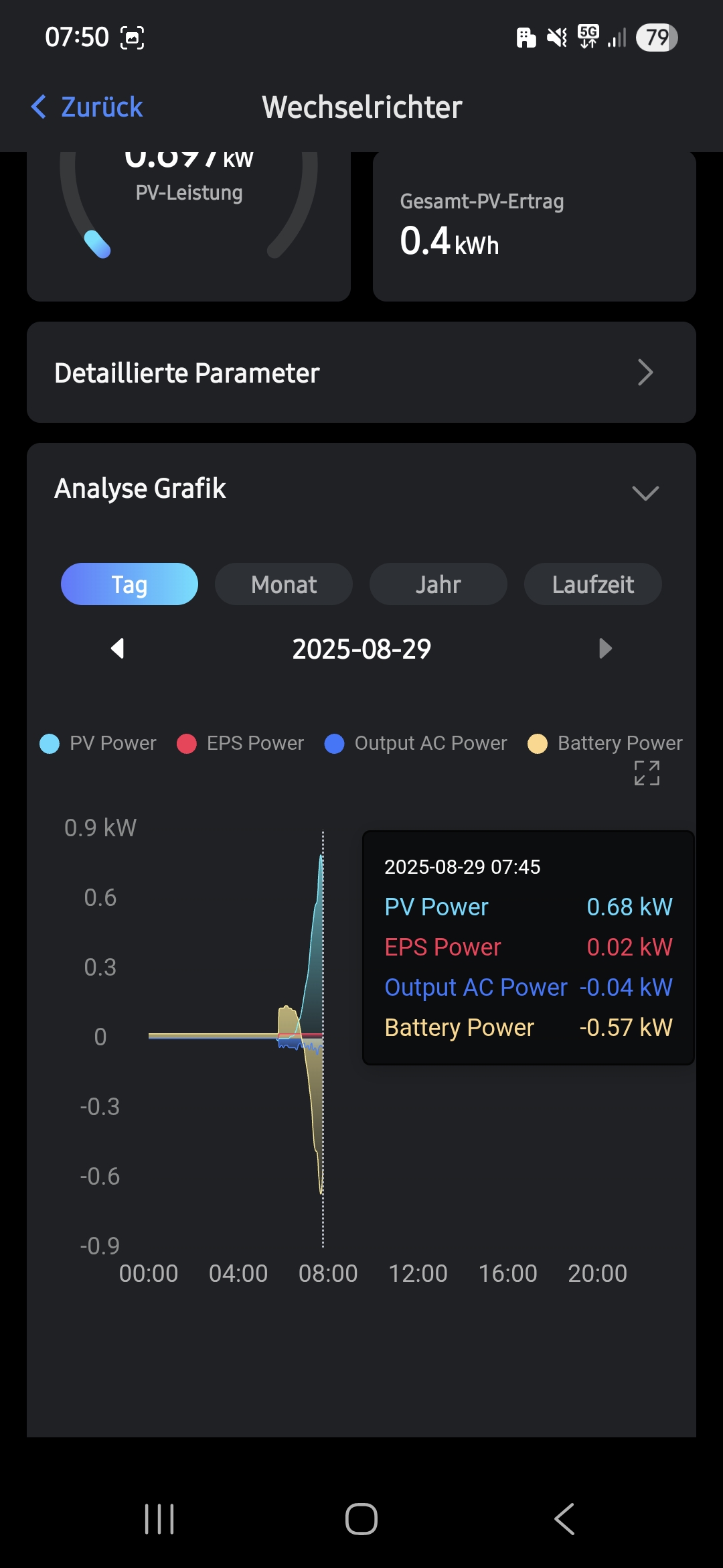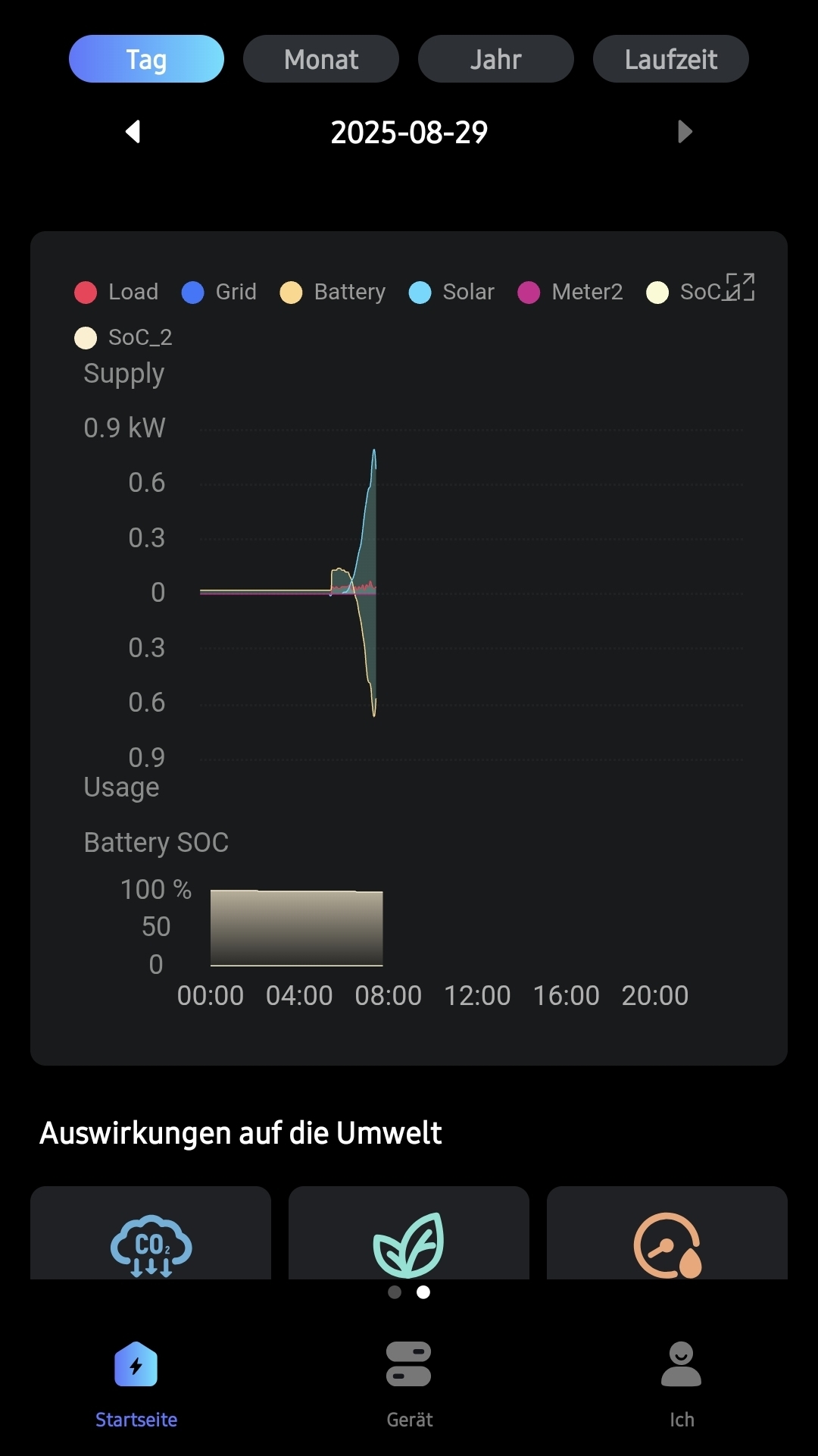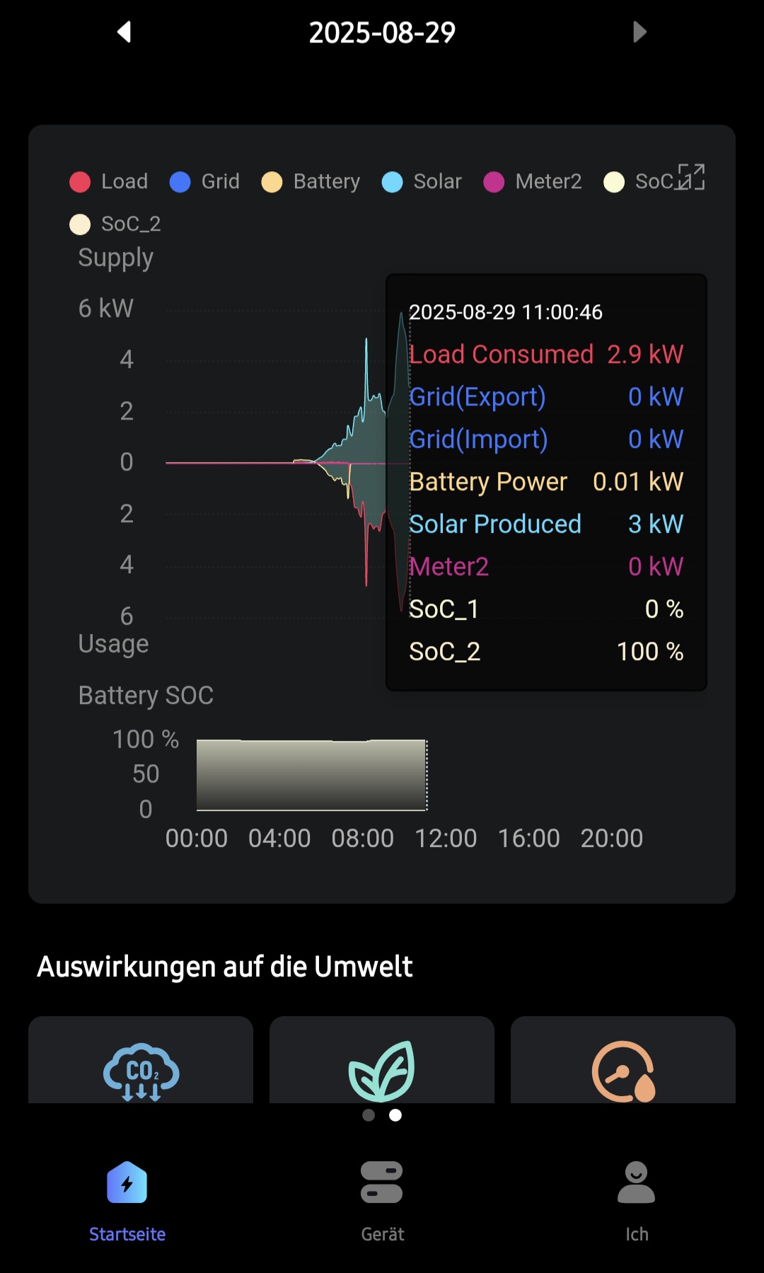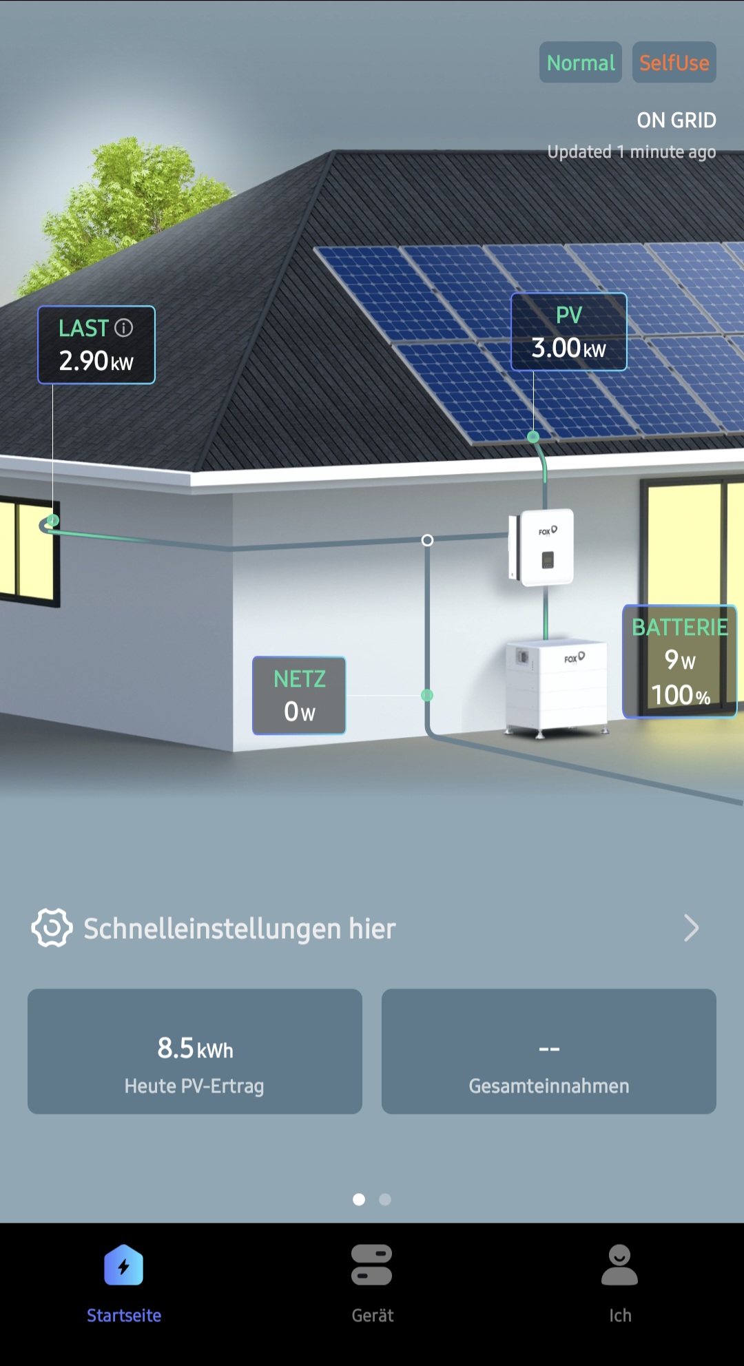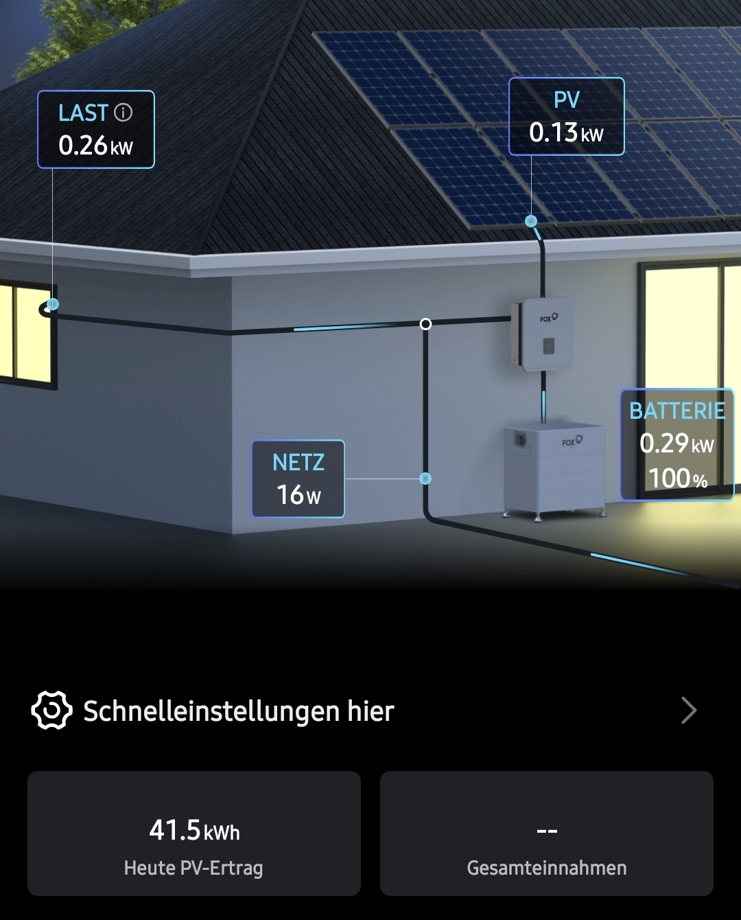 Ich weis aber das das richtige Smartmeter erst Ende September kommt. Aktuell ist der alte Zähler noch verbaut. Und Einspeisen dürfen wir auch noch nicht. Deswegen passen sich die Solarpanels an die Last vom Haus an. Die Batterie, wenn voll, wird dann nur abends benutzt, oder wenn keine Sonne scheint.