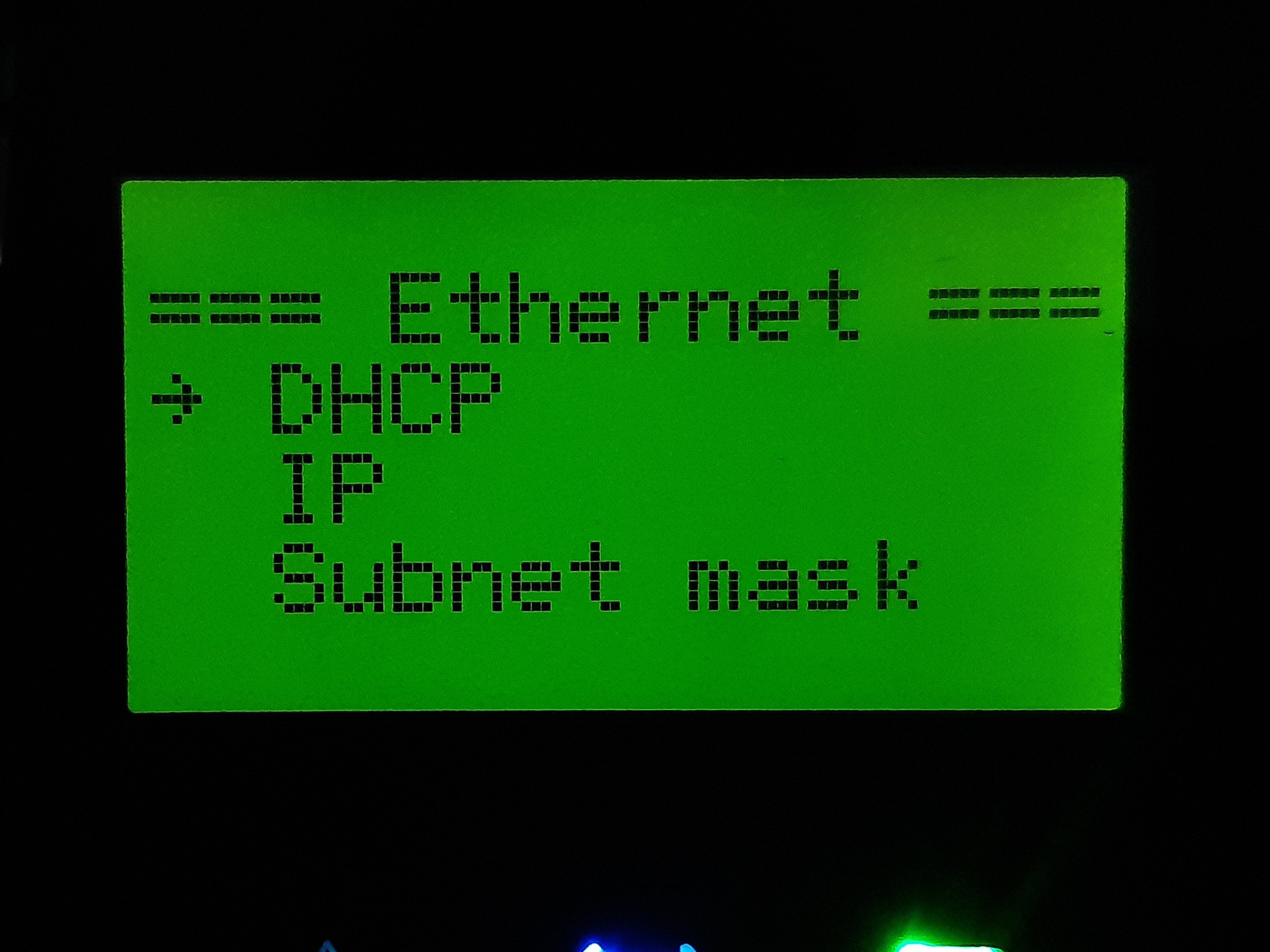 In the menue "Einstellungen/Settings" -> "Ethernet" there is only "->DHCP". (no "IP" or "Subnet mask").
