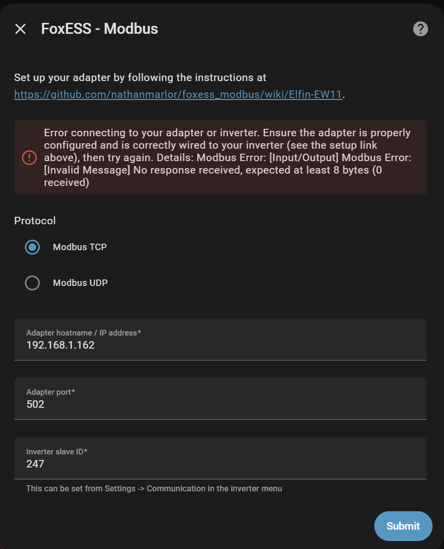Configured the EW as per this page: https://github.com/nathanmarlor/foxess_ ... Elfin-EW11