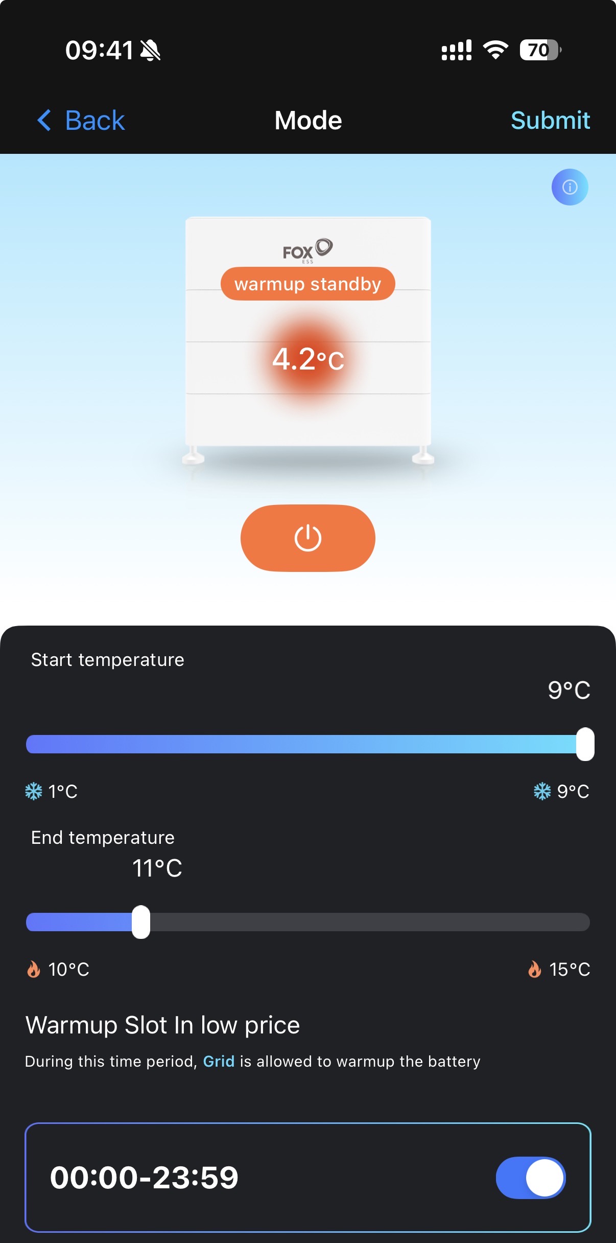 There are actually a variety of different battery temperatures, I suspect the high one is the BMS battery temperature, which is the temperature inside the BMS. This will be noticeably higher than the 'BMS cell temperature low' reading, which is the temperature of the coldest cell. The 'BMS cell temperature low' is the important one as far as the battery heating system is concerned.However, the fox ess cloud data is showing the battery temperature as much hotter (which doesn't make much sense as it's 6c outside).