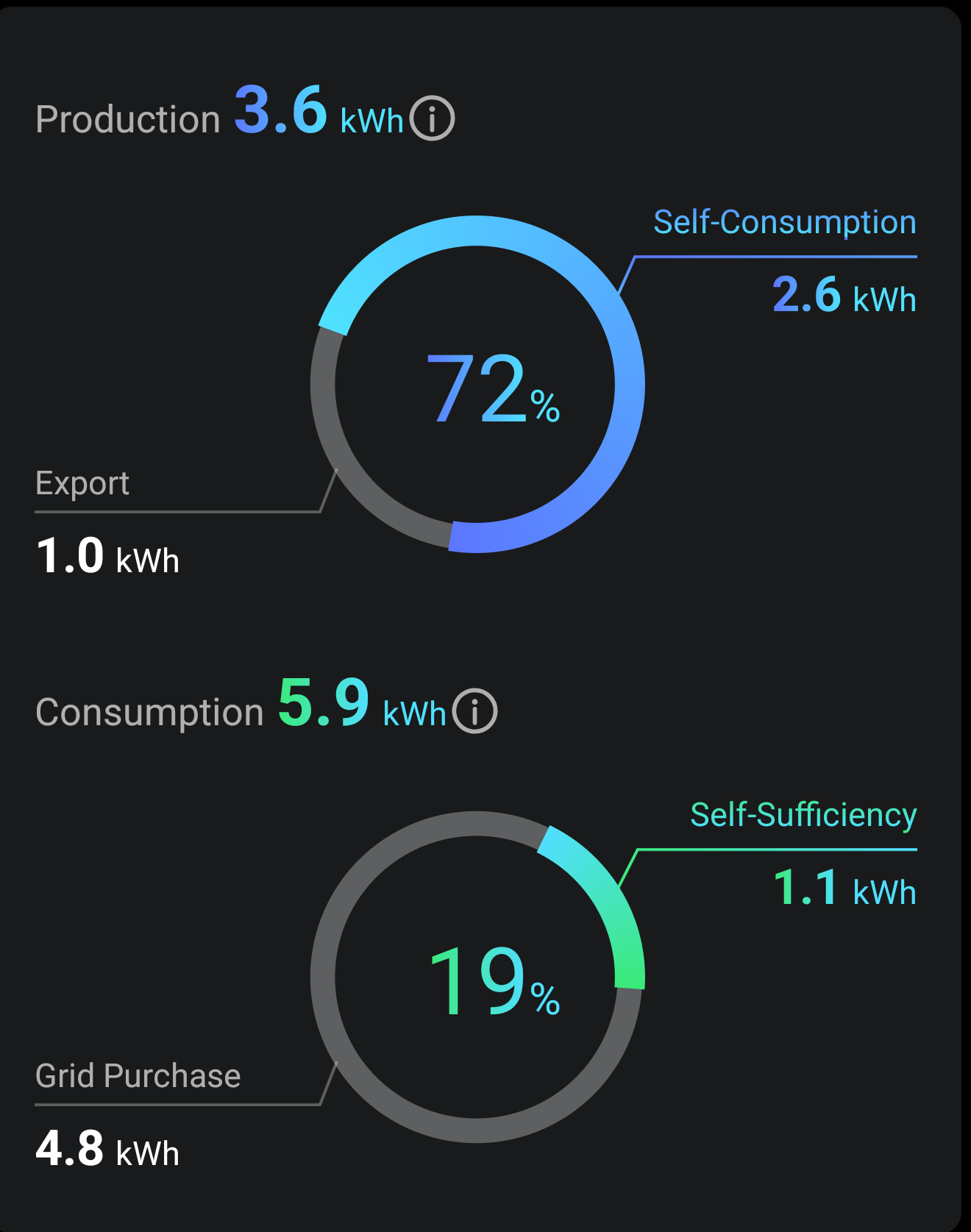 According to my data, my self consumption of what was produced is 2.6kWh today. However, under Consumption, it says I only used 1.1kWh under self-sufficiency, and purchased the rest. So where is the 1.5kWh difference? My battery SOC started and ended at 20%, so it's not gone into battery charge.