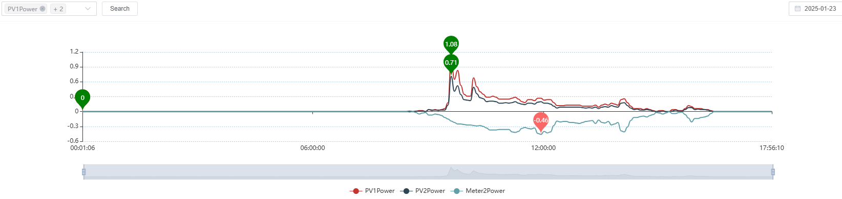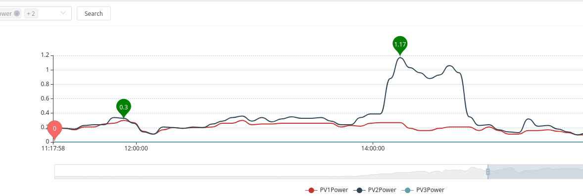 Just had a new system fitted a couple of weeks ago and I'm confused about the data sent from the inverters to the app and Foxcloud. When I log in to either the app or the cloud website I can only see the PV output of my 2 sets of panels which are connected to the hybrid inverter and not the set connected to the string inverter. So in the screenshot below, only PV1 & PV2 power levels are registering in the graph and PV3 is just a flat line at zero: