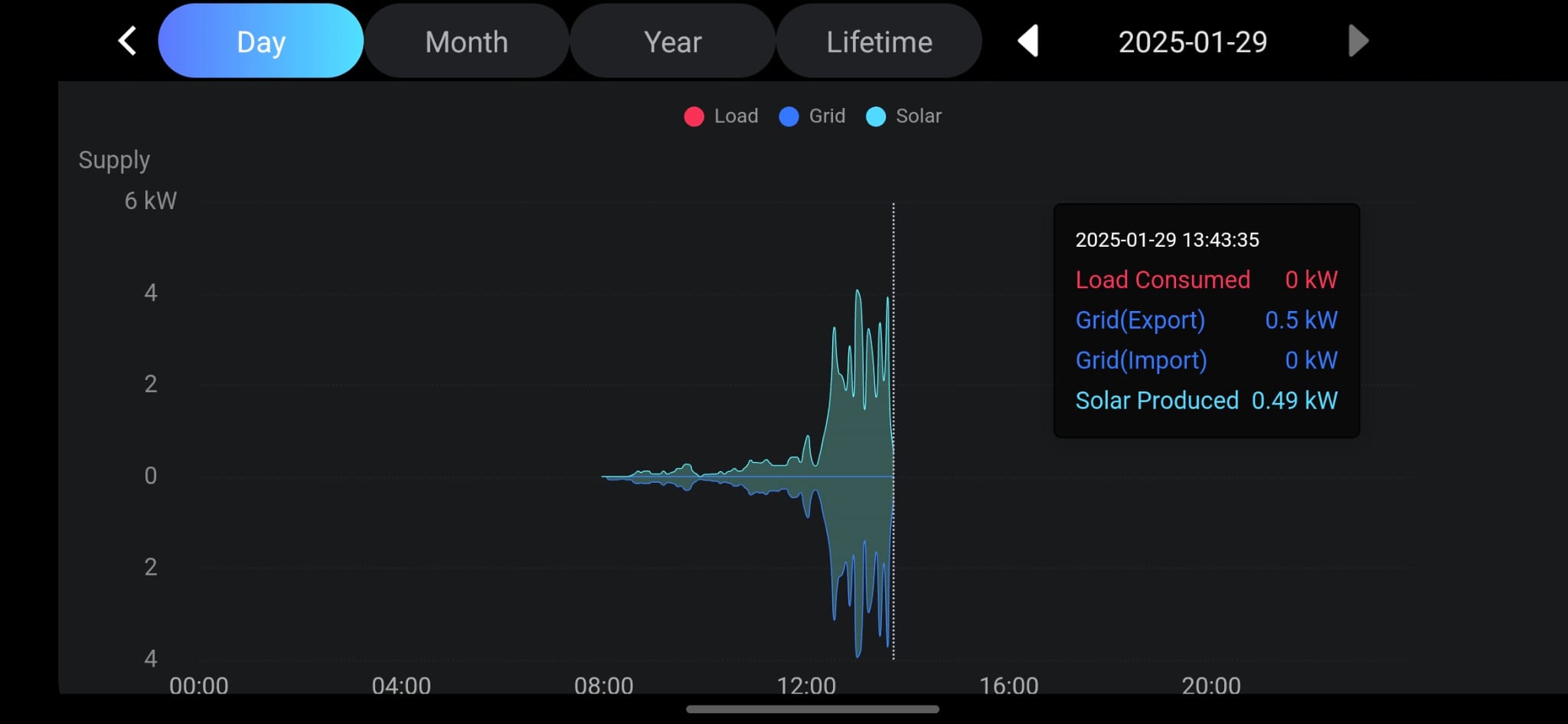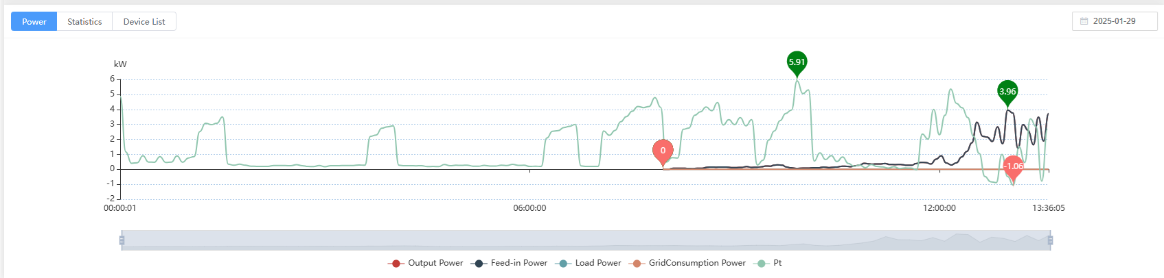 This chart has the solar energy produced (black line) and the Pt only (I guess the result of Load - Solar produced). But as we can see, it has nothing else, namely the Load over time or the grid consumption power, which are always zero.