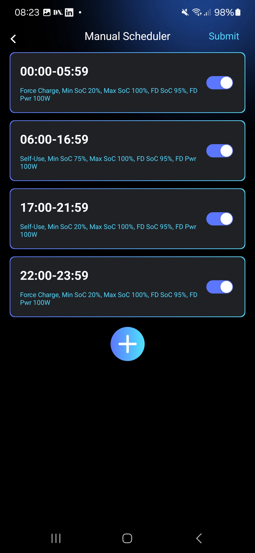 The problem is that I can't get the mode schedule to Force Charge more than once after cycling the system down and up (down: Battery, PV DC, Grid - wait until screen is blank plus some - up: Grid, PV DC, Battery). My latest try I even had two Force Charge after one another (since low tariff passing midnight), but only the first charged and the following just acted as self-use hence draining my batteries during cheap hours. Using the standard/simplified force charge is working multiple times though.
