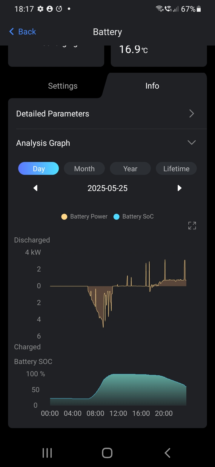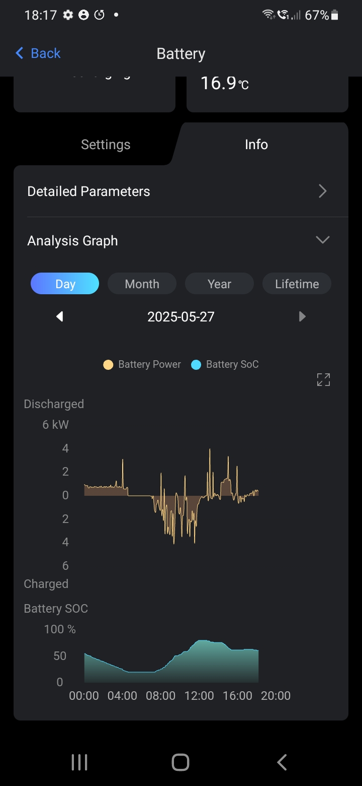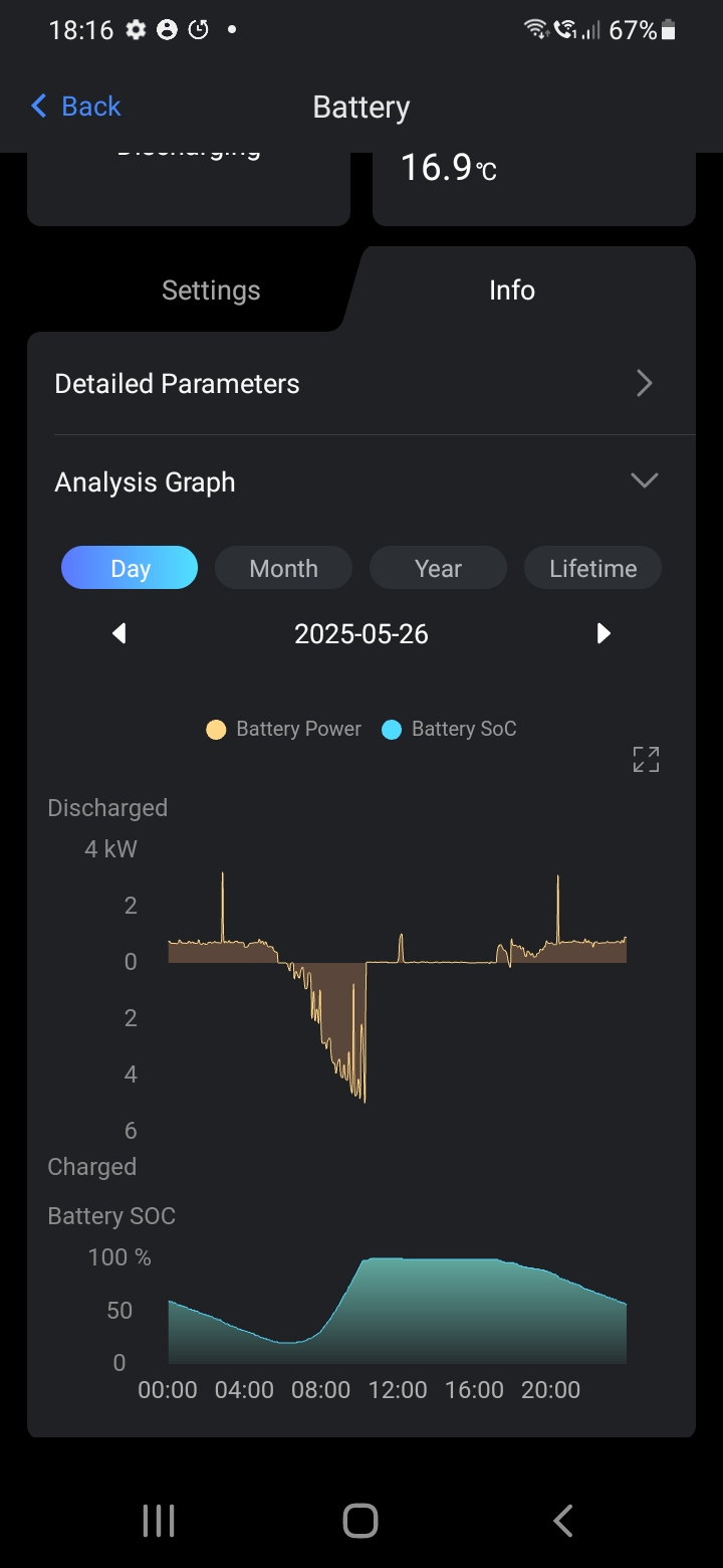 Hi I have posted previously about a system I have at home. Today I am posting about a system I have had installed at my Village Hall. This consists of one 10.36kWh battery (ESS EP10) and inverter ESS AC coupled inverter)working alongside an existing 7.2kW solar system. The system started working in mid May and I have been observing its performance. We are not charging the battery from mains overnight, just using the solar power when available. What appears to be happening is that the battery will get upto 100% easily in the day and stay fully charged whilst the sun is shining, then from around 20:00hrs the battery starts feeding the hall's base load (undefloor heating) of around 0.75kW. By around 04:00hrs the battery is down to 20% min SOS. I've taken these figures from the Fox app so I could do with accessing more accurate data. At current ambient temps I thought I would be getting over 8kWhs out of the battery but htink I'm lossing 1.5kWhs somewhere. Any thoughts on how the battery should be performing, how I can get more accurate data and how can I improve things. Rgds