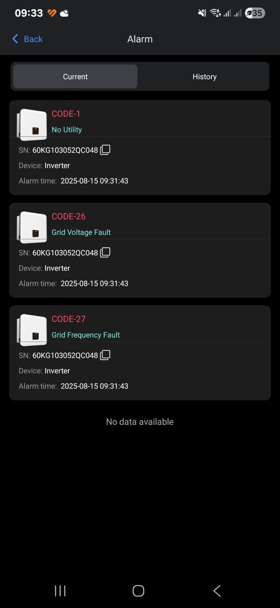 I had my system installed 3 weeks ago, this morning I noticed that my battery didn't charge overnight and there is an alarm on the app showing code 26, 27 and 1.